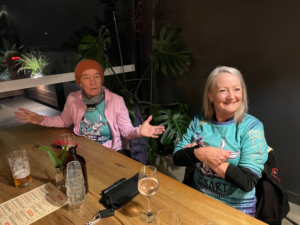 When true trail headed back down to the Brooker (100m from the check, and in the direction that ITR had ‘checked’) I used knowledge gleaned from the Hare to Hash uphill, via one of Lutana’s network of laneways. I didn’t get far as I ran into Sonar and Magic Touch heading in the opposite direction, having lost trail.