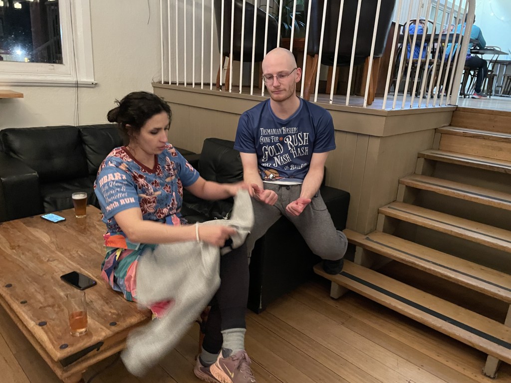 Most were happy to be out of the wind, with a cold beverage in hand. The exception being In The Raw, who was too tired from carrying the cloth yoke of stupidity around for the entire trail, BECAUSE IT DID NOT RAIN!