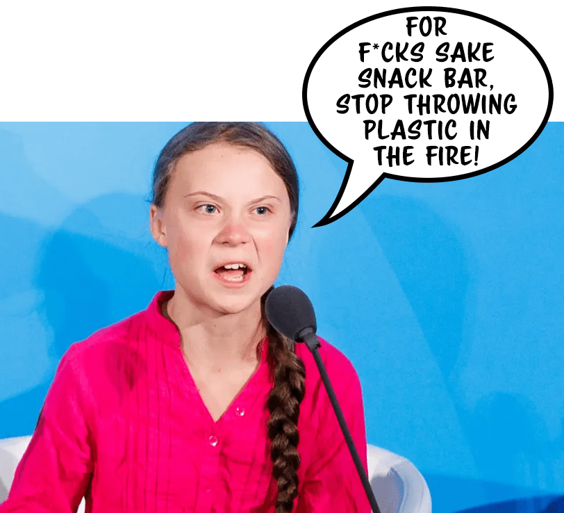 - Snack Bar – ecological vandal, burning plastic in the Firemaster 5000 and turning Morning Glory’s fillet steak into a black toxic mess.