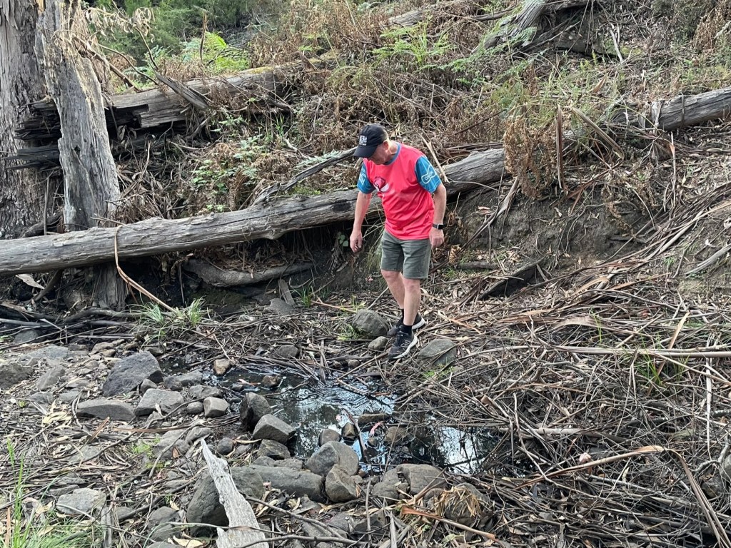 Out of the gully we found an early explorer’s message tree, with a trifecta of pink tape, chalk and bark indicating the way forward.