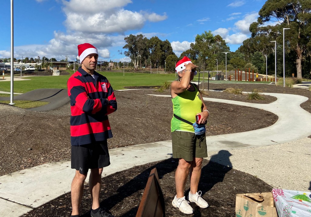 I didn’t fancy the likes of Nancy Boy jostling for position against the Parkrunners on the ‘run’ home, so took the Hashers over the creek and along the road less travelled. I had reconnoitered the bush track months ago and don’t recall having Hashed there previously so claimed it as virgin territory, which I thought was Christmas-appropriate.