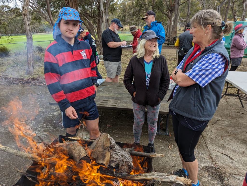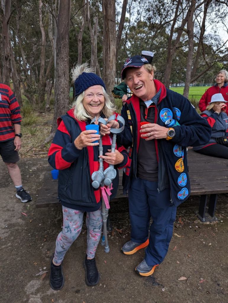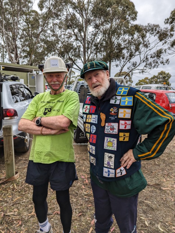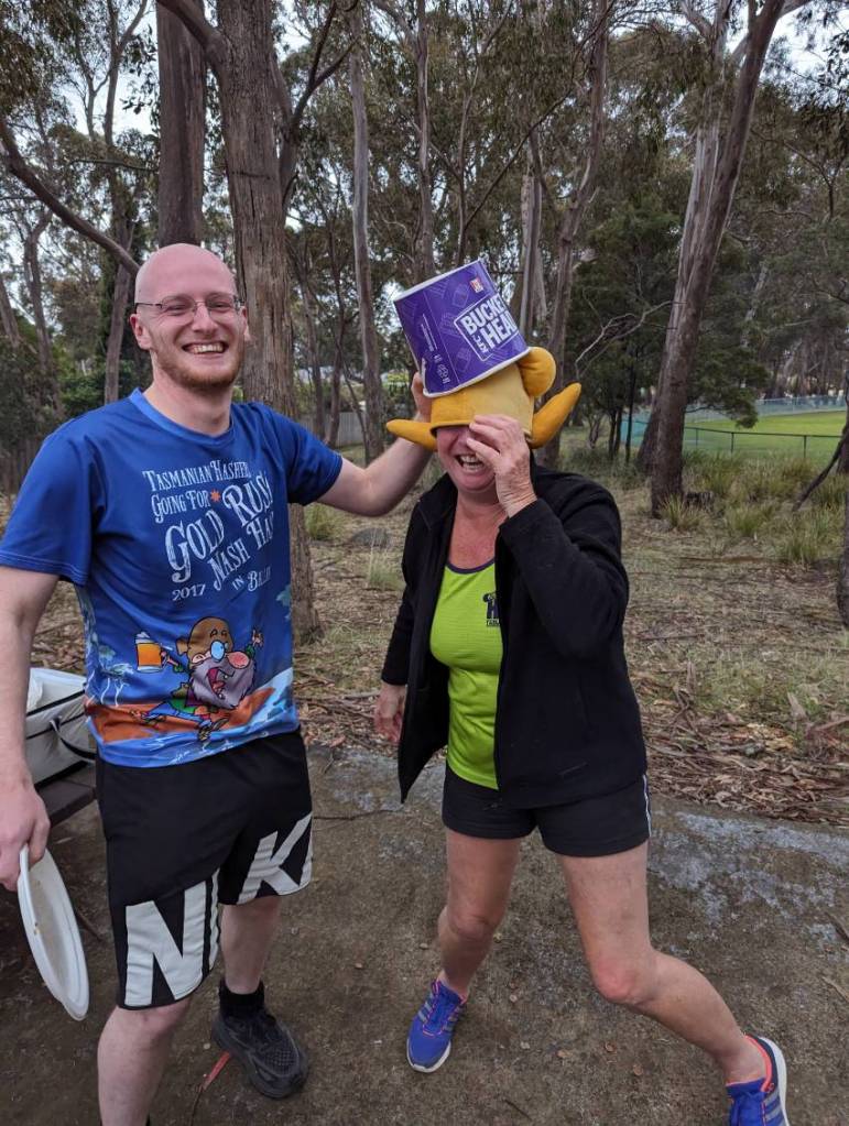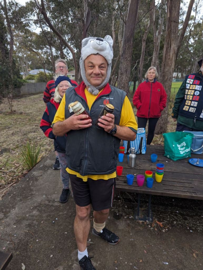 This was, of course, one of Steady Eddie’s infamous hat themed trails. Steady, a bit traumatized by the abuse he had previously copped in judging Best Hat competitions, designated Cracker as the judge due to her impeccable reputation for a fair and unbiased approach. The two winners, presented with liquid prizes by Steady Eddie, were Sir Eve, with a furry critter, complete with evil glowing eyes, sitting on his head, and Miss Bling, for pure sartorial elegance. Dishonourable mentions went to Thrill Seeker for once again wearing his mouldy toucan, and Rigor Mortis for ignoring the No Birds instruction and wearing a chook on her head. Honorable mentions went to Bee’s Dick (with a purple bucket to stick Rigor Mortis’ chook in), Big Bang (with a Steady-proof hat), and Magic Touch (for another cute fluffy creature).