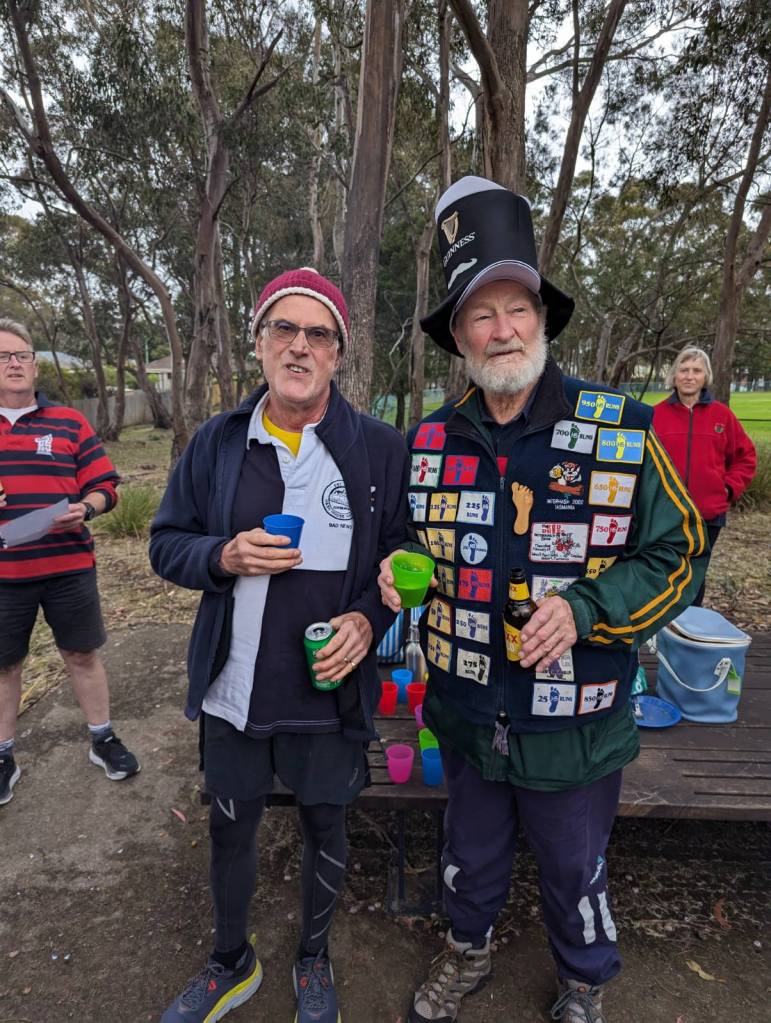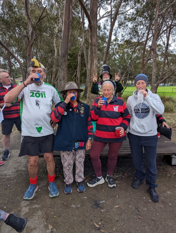 Steady Eddie, resplendent in his Guinness hat, issued pre-trail instructions to the usual Hash hoots of derision. The pack set off around the Mt Nelson oval and through a mixture of fire trails, bush tracks and roads. Clever use of runners’ loops resulted in the runners (with varying degrees of athleticism) passing the walkers time and time again. Temporary Hash Flash ITR took his duties seriously, with some hobbling attempts at pseudo-athletic moves to photograph the runners and some short cuts through the bush to catch photos of the rest of the pack. Next Week suggested that ITR should be made permanent Hash Flash to give him a purpose in life. Personally, my money is on ITR for Hash Hops – let’s make dark beer great again!
