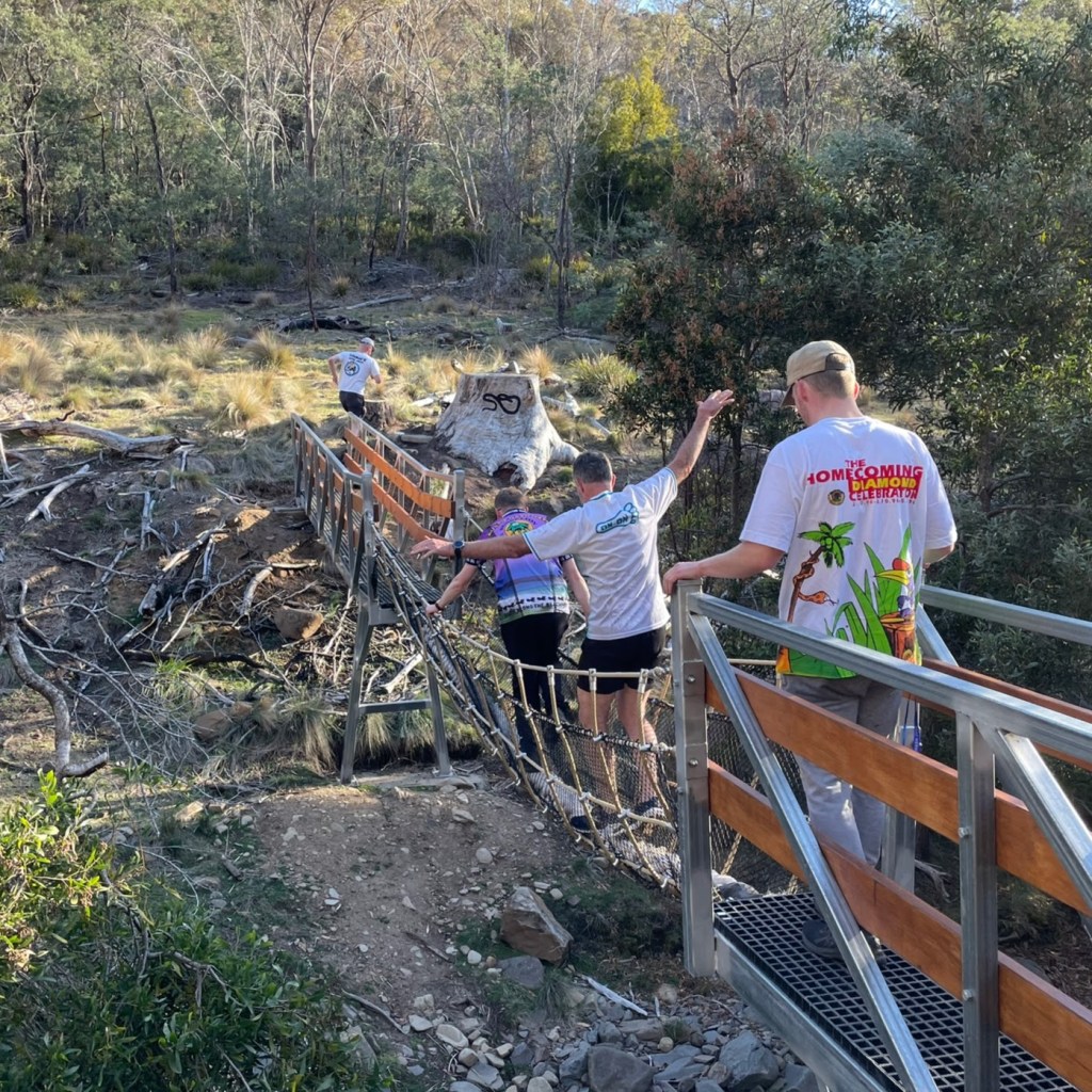 Those who felt JK’s dark hole to be a bit too adventurous for their tastes headed back to the on-on along the main path, before being convinced to again tackle the bridge of doom to the track on the opposite side of the creek. Having missed the first traverse, Mr Bean performed as if he’d just stepped off the stage at Cirque du Soleil. (Not as a performer – probably more post-performance clean up.)
