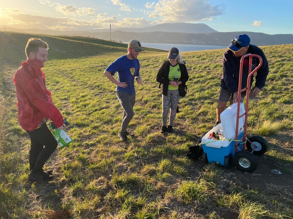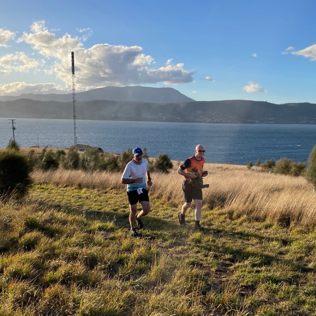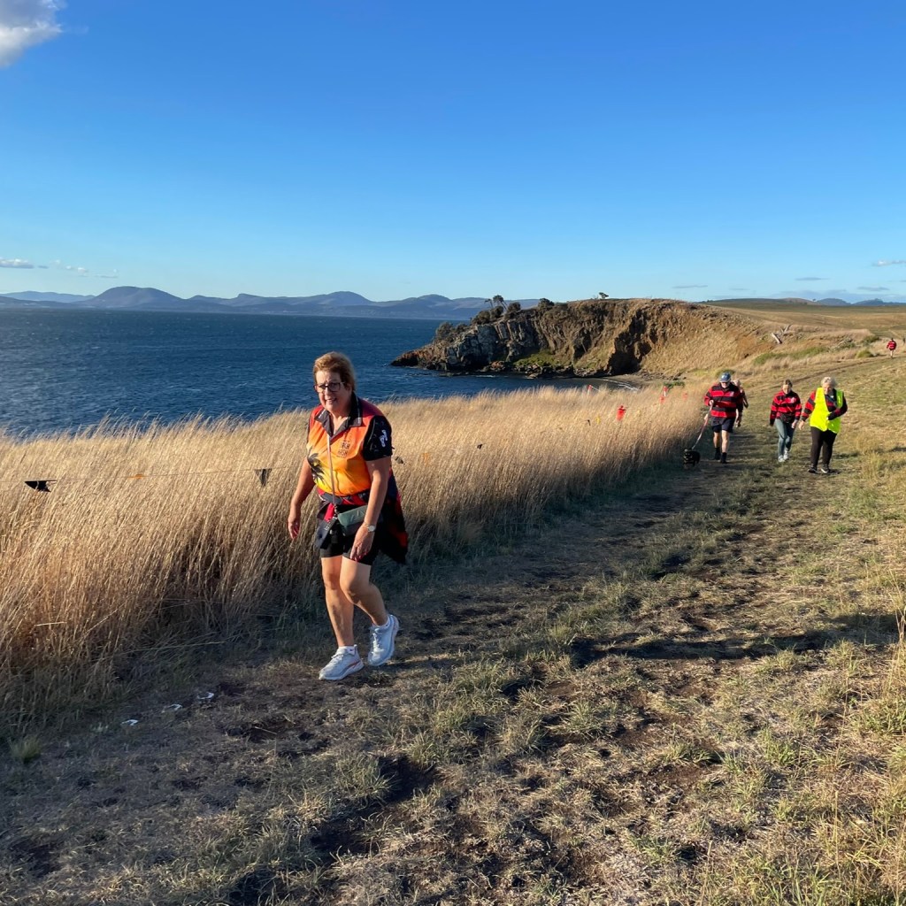 Trail would largely follow the outline of the peninsular, with a few false trails thrown in to test the trail-following integrity of the front runners and walkers. The land is being prepared for a links-style golf course, irrigated by treated effluent from the Blackmans Bay treatment plant. If I was at all concerned by the thought treading on one of my more aggressive ‘cast-offs’, it was soon overshadowed by Triple K’s canine explosive decompression. (Just to be clear, it was Triple K’s dog, Harry, not Triple K herself.)