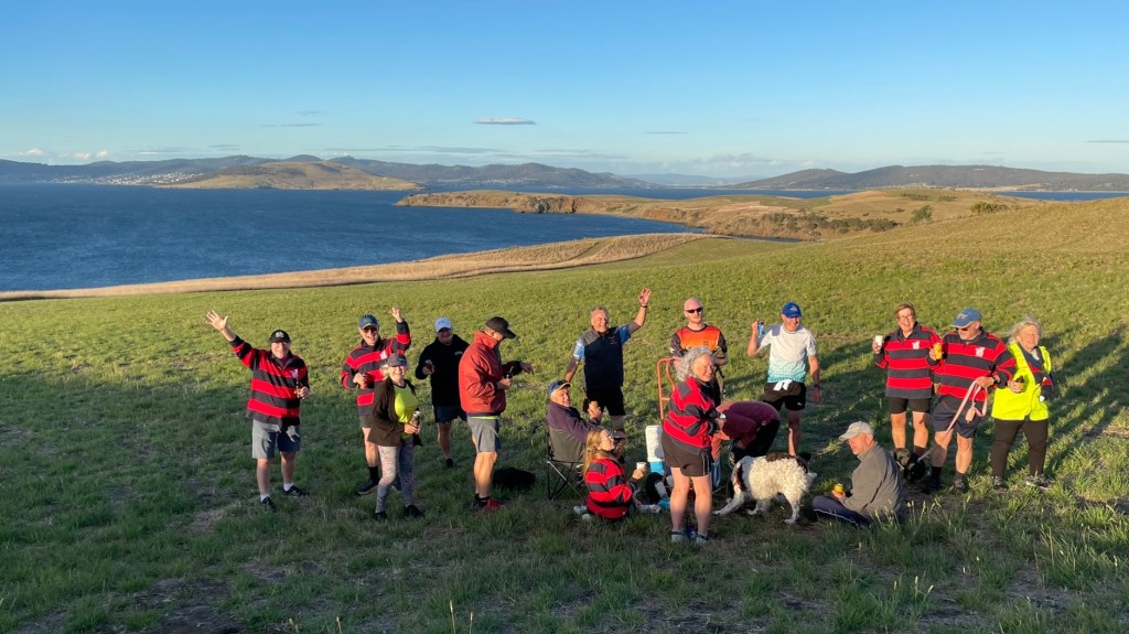 As we neared the communications tower at the western point of the Reserve we could spot a cold and lonely figure sitting not quite at the top of the highest point of the peninsular. This was the Hare with the “greatest p!ss stop of all time”.