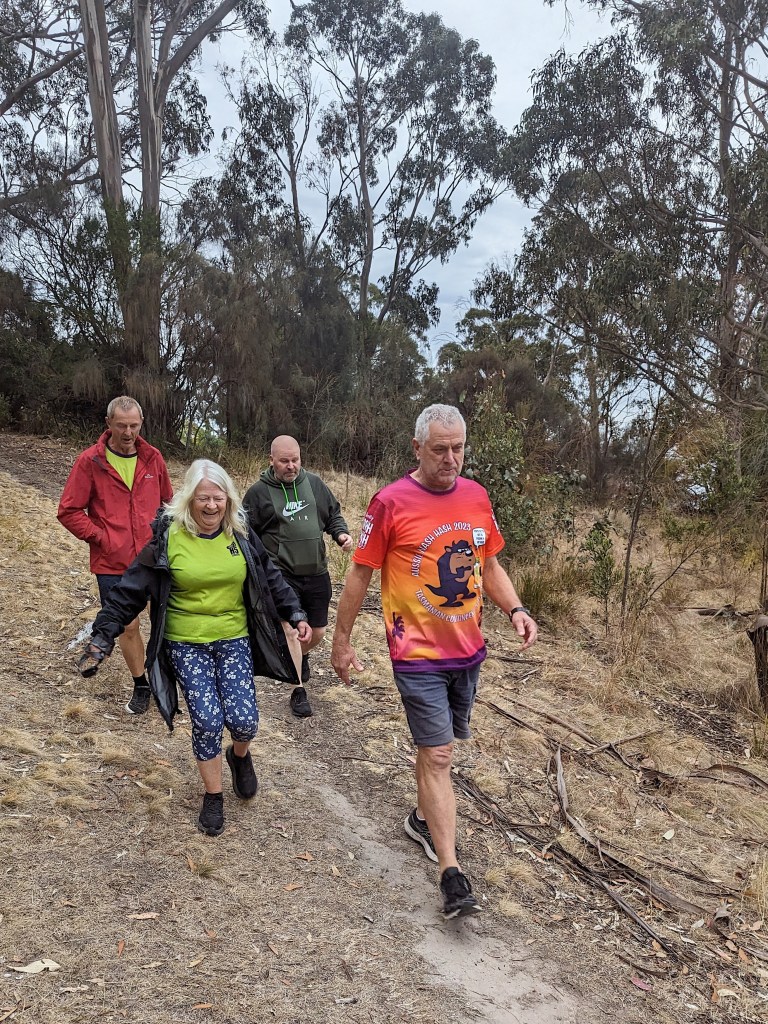 Around behind the Scout Hall – not for the first time for some – then up toward Peter Murrell Reserve. Quite a bit of up.
