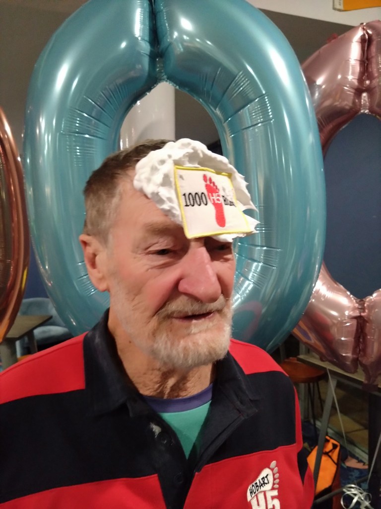 Back at the On On and after the meal so generously supplied by Incoming (what Hasher doesn’t love a free meal?), the main business was the bestowing of Steady’s honorific and his admittance to the Royalty of H5. Our GM, Clearfell, had left delegation instructions: ‘Your esteemed GM can’t be here in person for this auspicious occasion of Steady Eddie’s 1,000th run. An awesome achievement on his part, along with all the Hashers who have walked with him and endured lengthy conversations during said walks. We doff our collective hats to Steady. I have put ITR in charge of the hallowed H5 cream to undertake our special ritual this evening.’