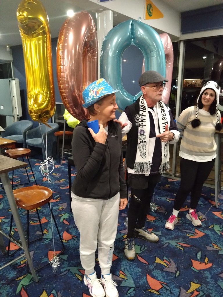 As for the walkers’ trail, who put all those hills in the way of our little promenade? Still, (puff) the views were nice (puff). I don’t know where the runners went, don’t care. We finally came to the site of the Piss Stop, Steady’s son Outgoing’s house in Montague Bay Rd. Ah, this was certainly a winner, with some seriously good gluhwein, champagne, and piping hot nibbles; it was immediately voted Piss Stop of the year. Big Bang, asked to rate the trail, gave it 7 out of 10, but increased that rating to 15 out of 10 once the Piss Stop was also considered. We would have happily stayed for longer, but Incoming was soon ushering us back to the On On and dinner.