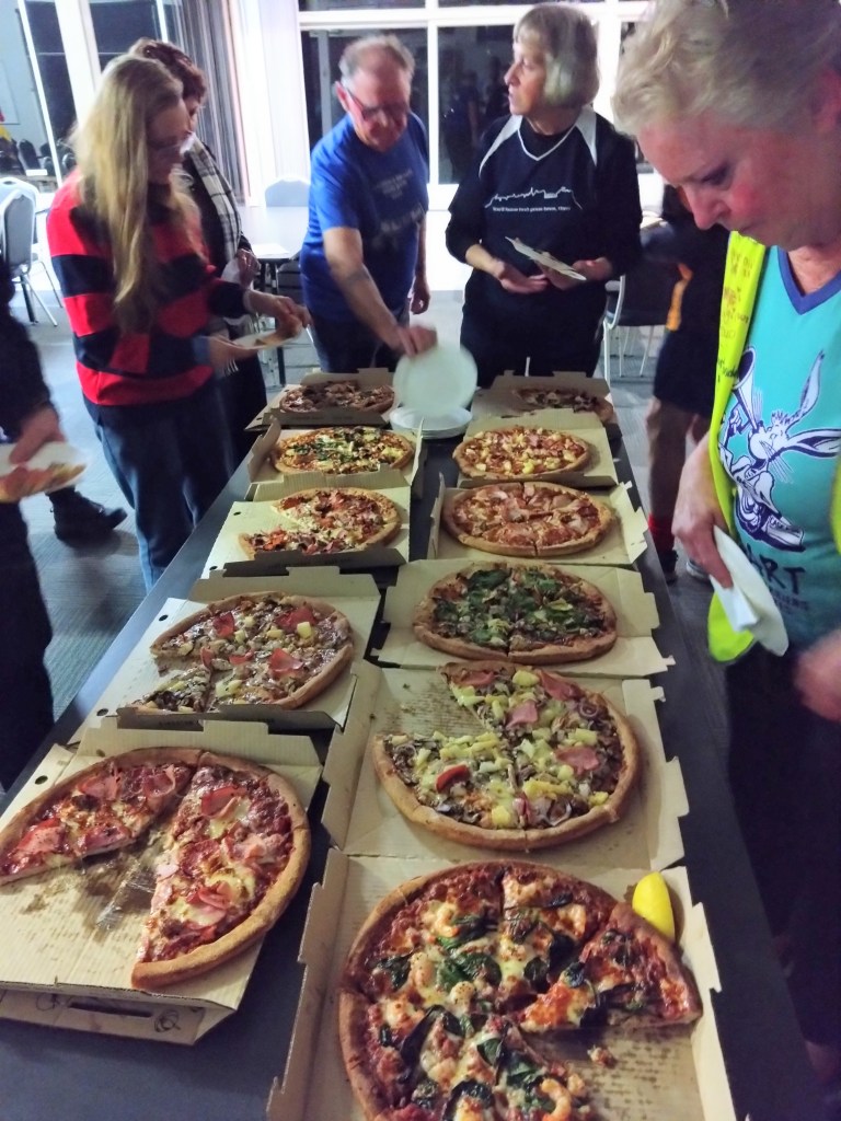 Trail headed up the old Cadbury trainline, before crossing the face of the factory and heading ‘home’. By the time we returned to the Bowls Club, the rest of the Pack were all silenced by a truckload of pizza.