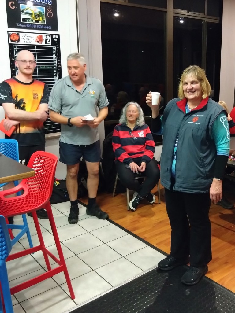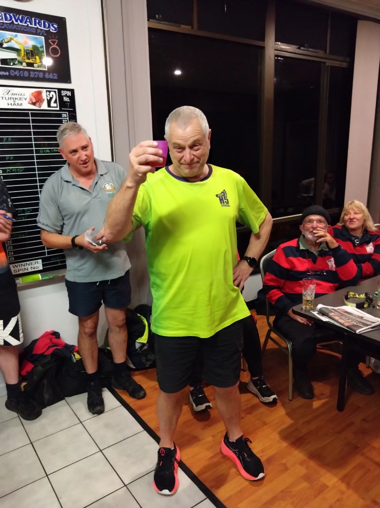 Wet Hare Growler drew attention away from drinks on offer at modest bar prices and made the usual excuses about trail being washed away, then proceeded to give a detailed description of the trail. (Pole Dancer and the Mensa running Pack were out the door before Growler could finish describing the topographical variations on Box Hill Road, so it was no surprise to later find them running trail in the reverse direction.)