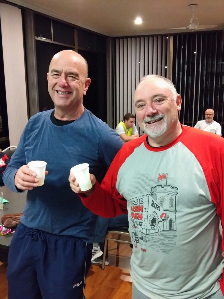 As is ordained in the book of Gispert, on the approach to Hash time the clouds slipped on their incontinence pads, and a much larger group of the faithful than expected gathered in the Bowls Club.