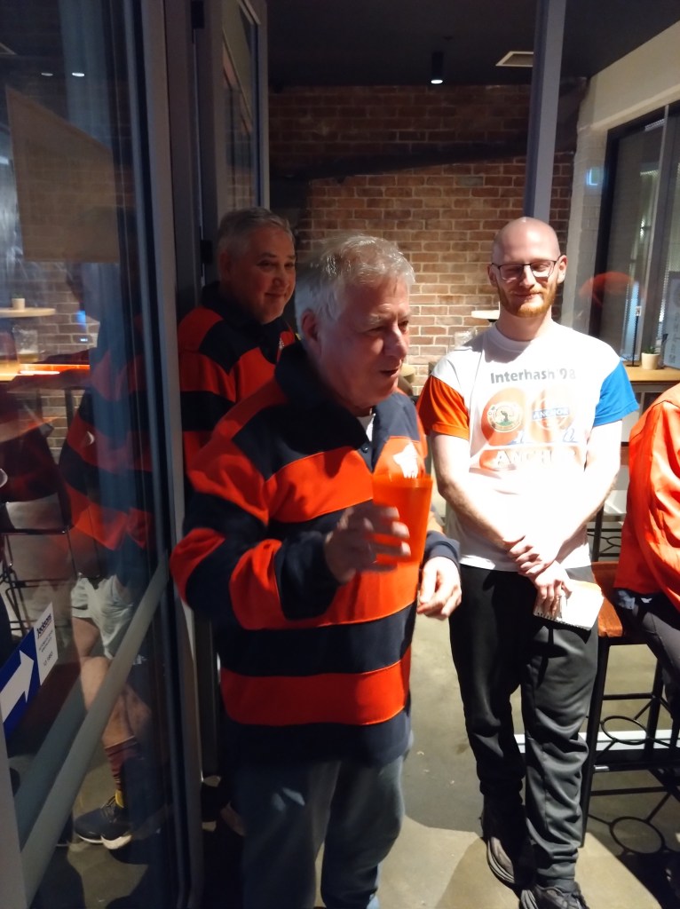 Hares Grassroots and Arsecutter came up with an innovative approach to setting trail through dark, dank, sodden streets: an envelope run. They handed out, to the chosen few in both runners’ and walkers’ groups, a series of envelopes, each containing the next destination. As each place was reached, the holder of the next envelope took over as leader of the troops. What a great idea; not only was there no trail to wash away, but it also kept the troops more or less together. Except for Jerk Off and Lone Arranger who, led into bad habits by Grassroots, shortcut the guts out of the trail.