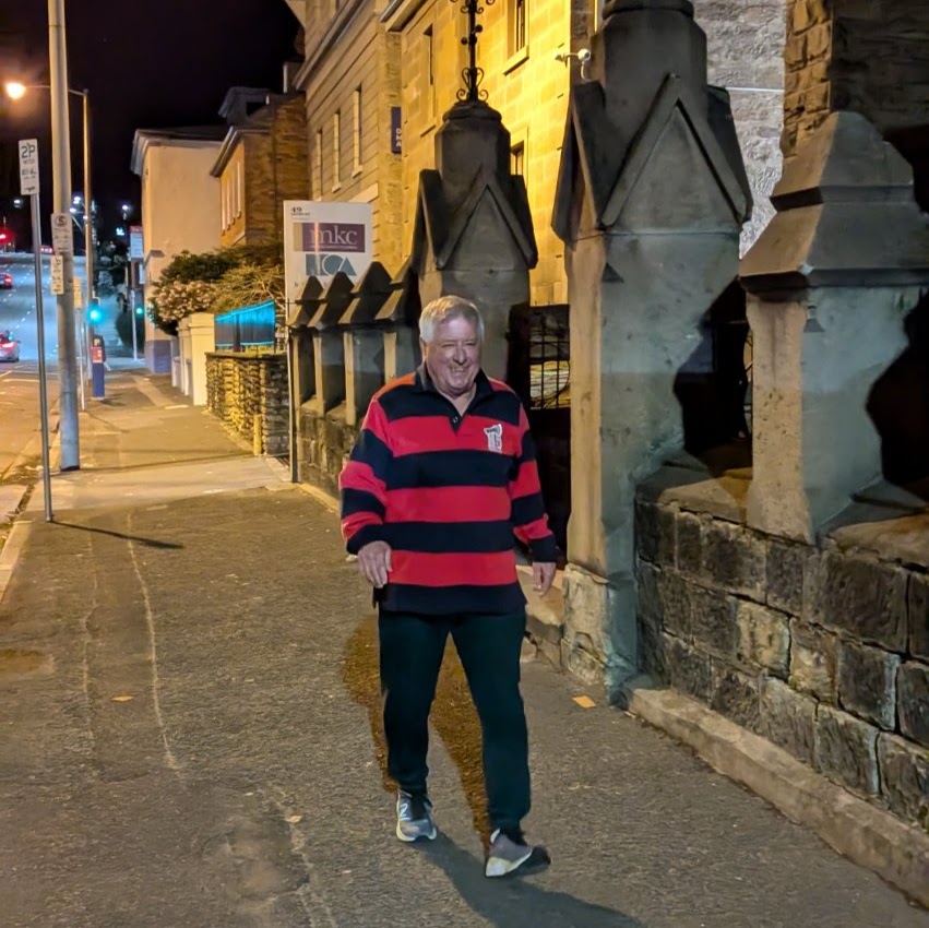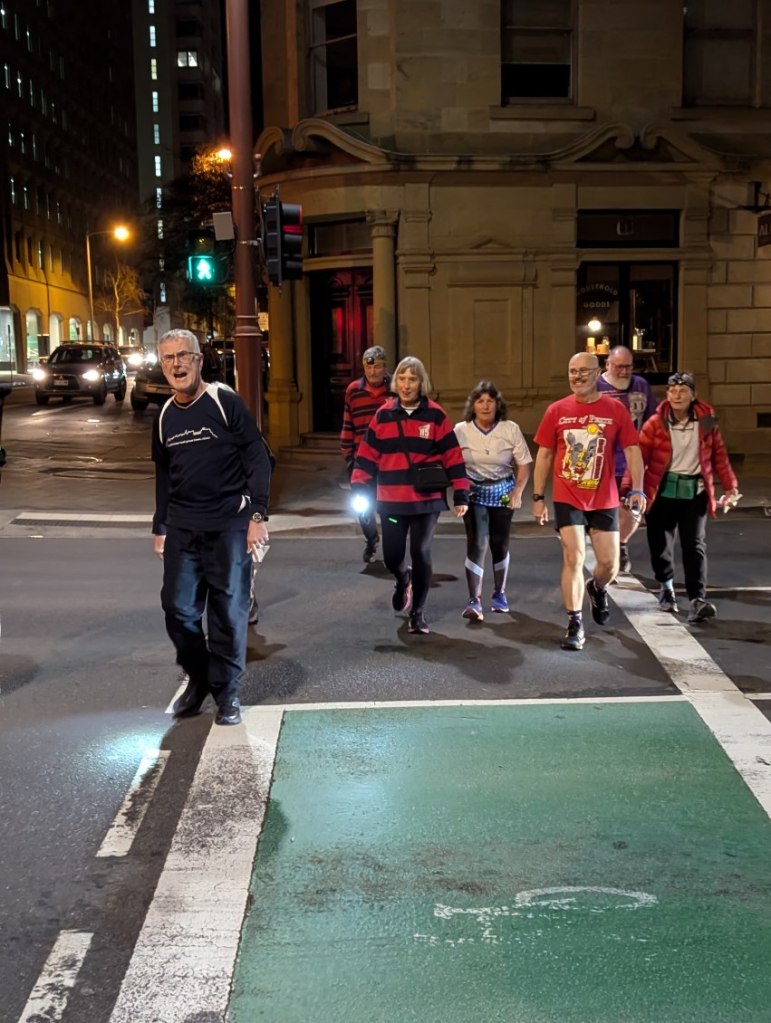 The walkers’ trail was excellent; Sir Eve added lots of interest to a city run by turning it into a wake for dead pubs, and the squeak points were most effective at keeping the pack together (aided by border collie ITR running in circles and barking at the heels of straying sheep Hashers). The runners disappeared quickly, but I have it on the best authority that they split at the Duke of York squeak point, then went up Macquarie St to the Wheatsheaf before coming back, and that they got to do Billy Goat steps. No time to stop and squeak in memory of dead pubs. It’s understood that Organ Grinder is faking an injury just so he can have more fun with the walkers’ group.