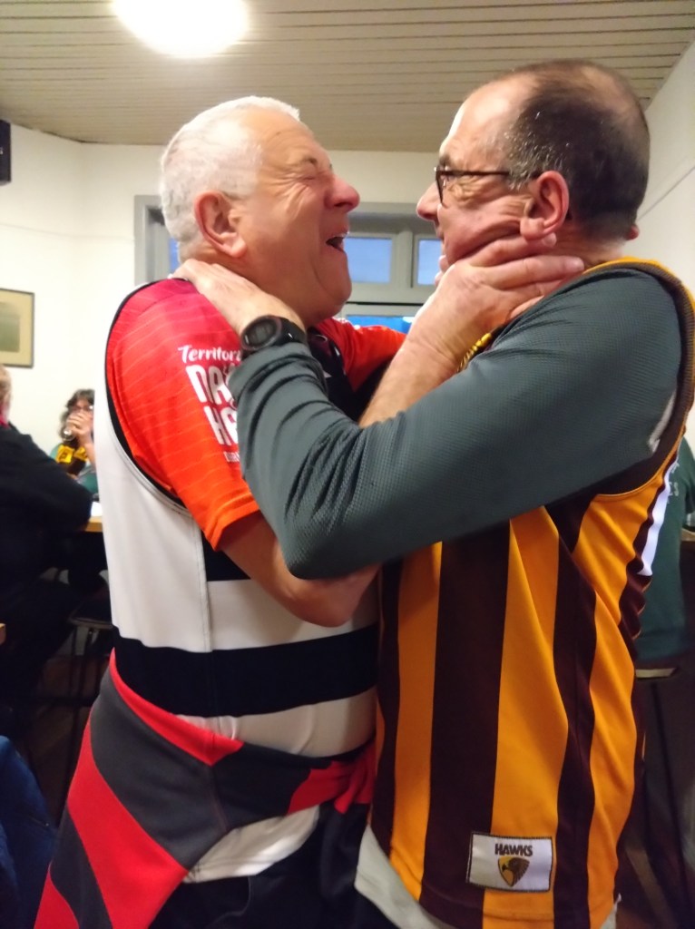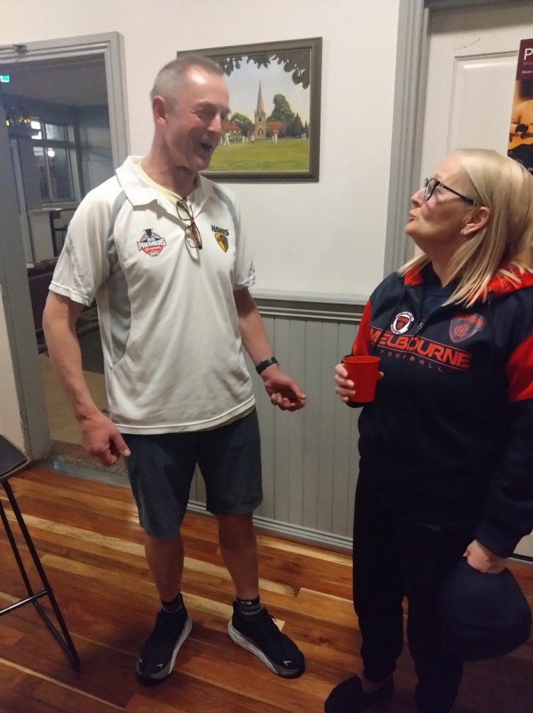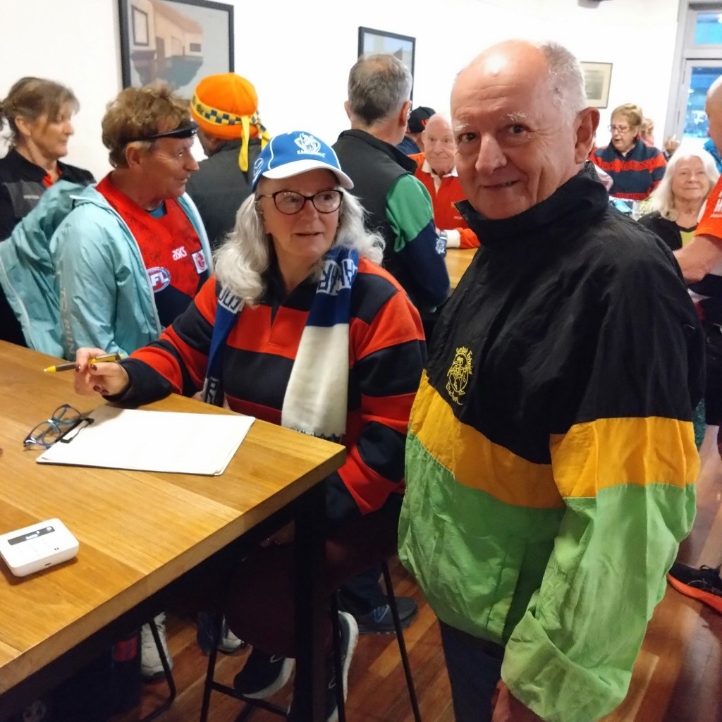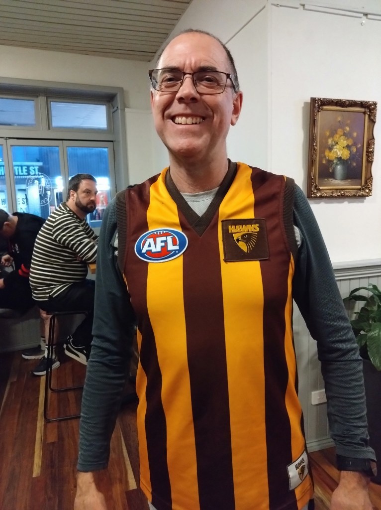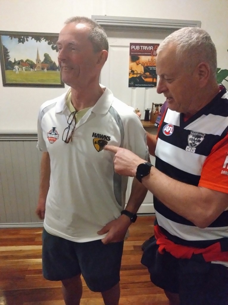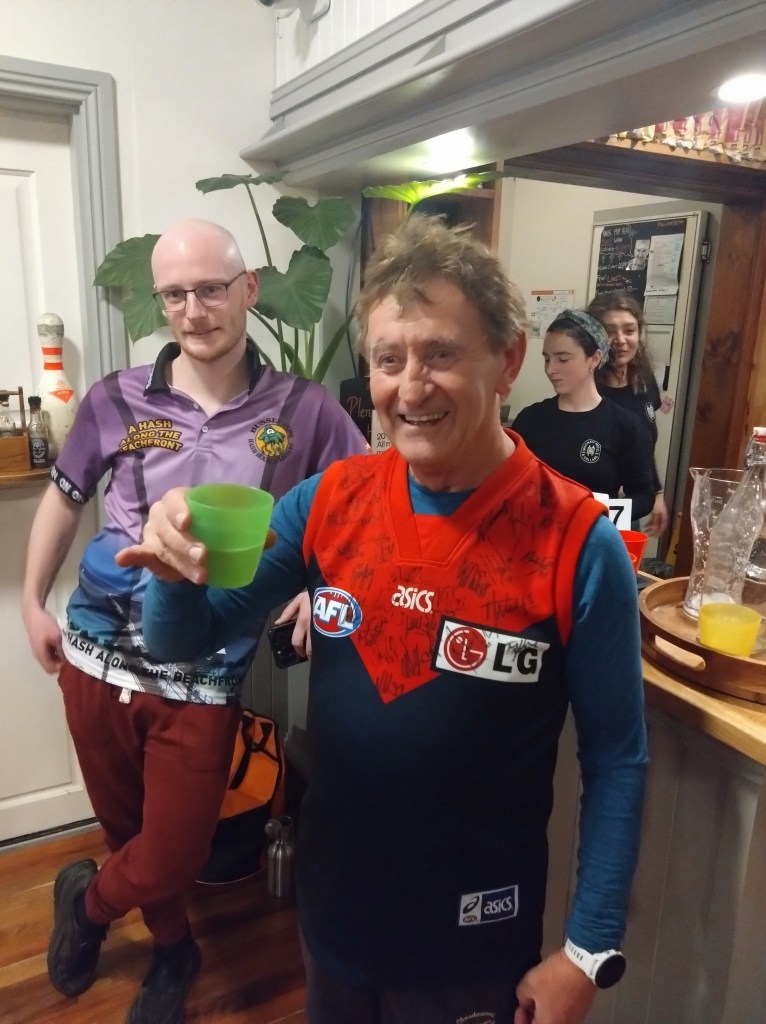 I’ve never really understood the religion of football. Carn the Wombats! But at least one H5 Hare, at this time of each year, will feel the call to offer a footy theme run, where fans and fake fans (it’s easy to identify the fake fans because they don’t know who wears their Club’s Number 1 guernsey) gather, all decked out in their Club’s colours. And so it was for Next Week’s Run 2300 from the Moonah Hotel.