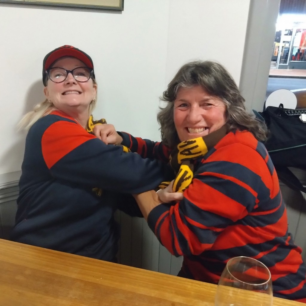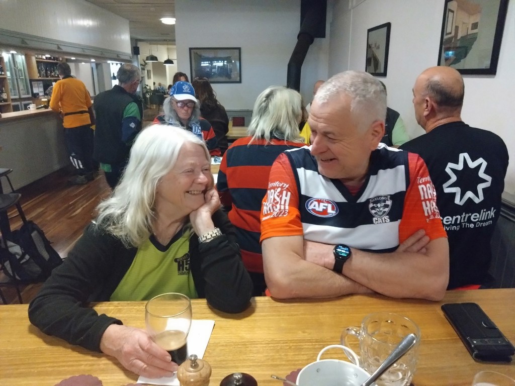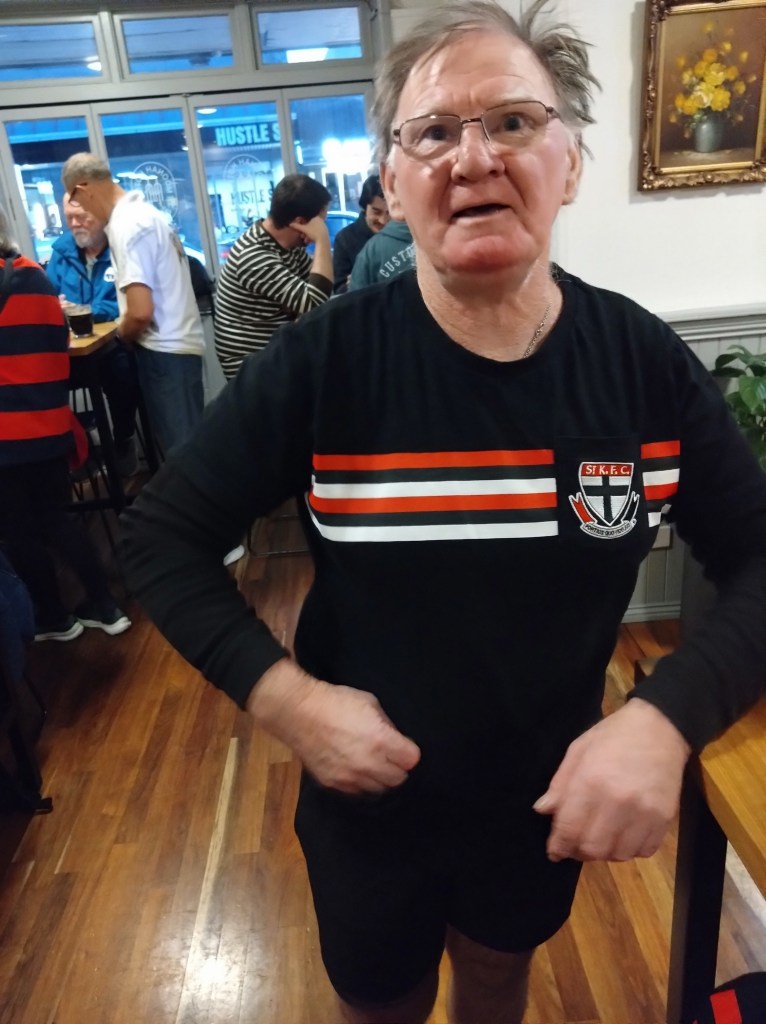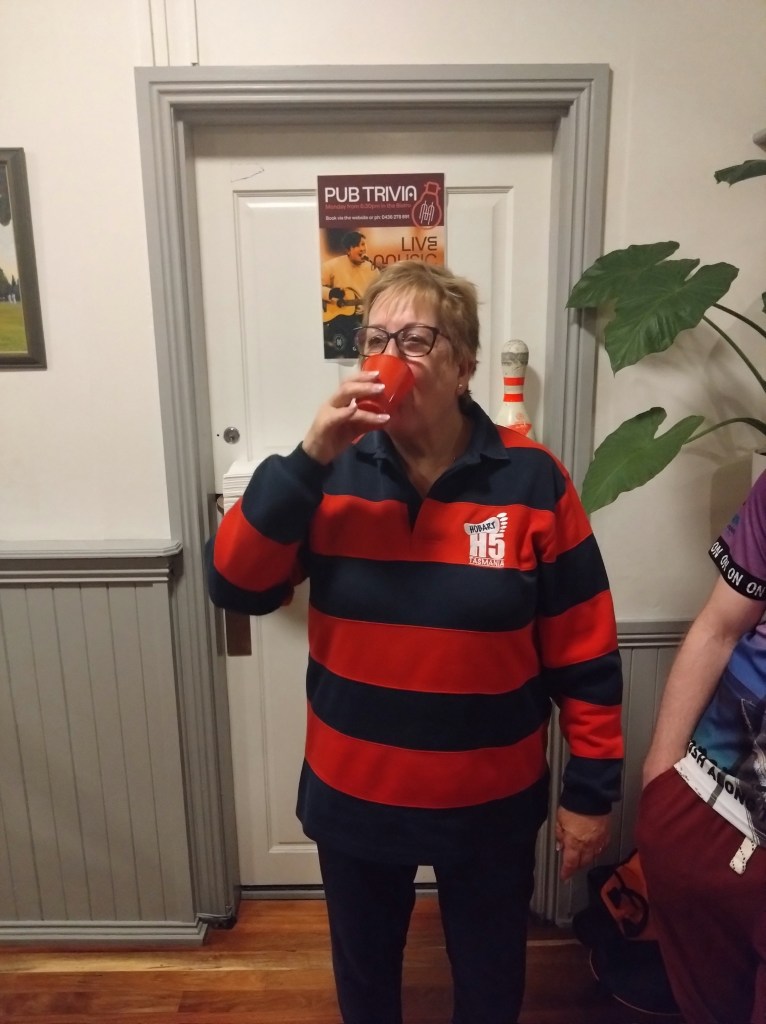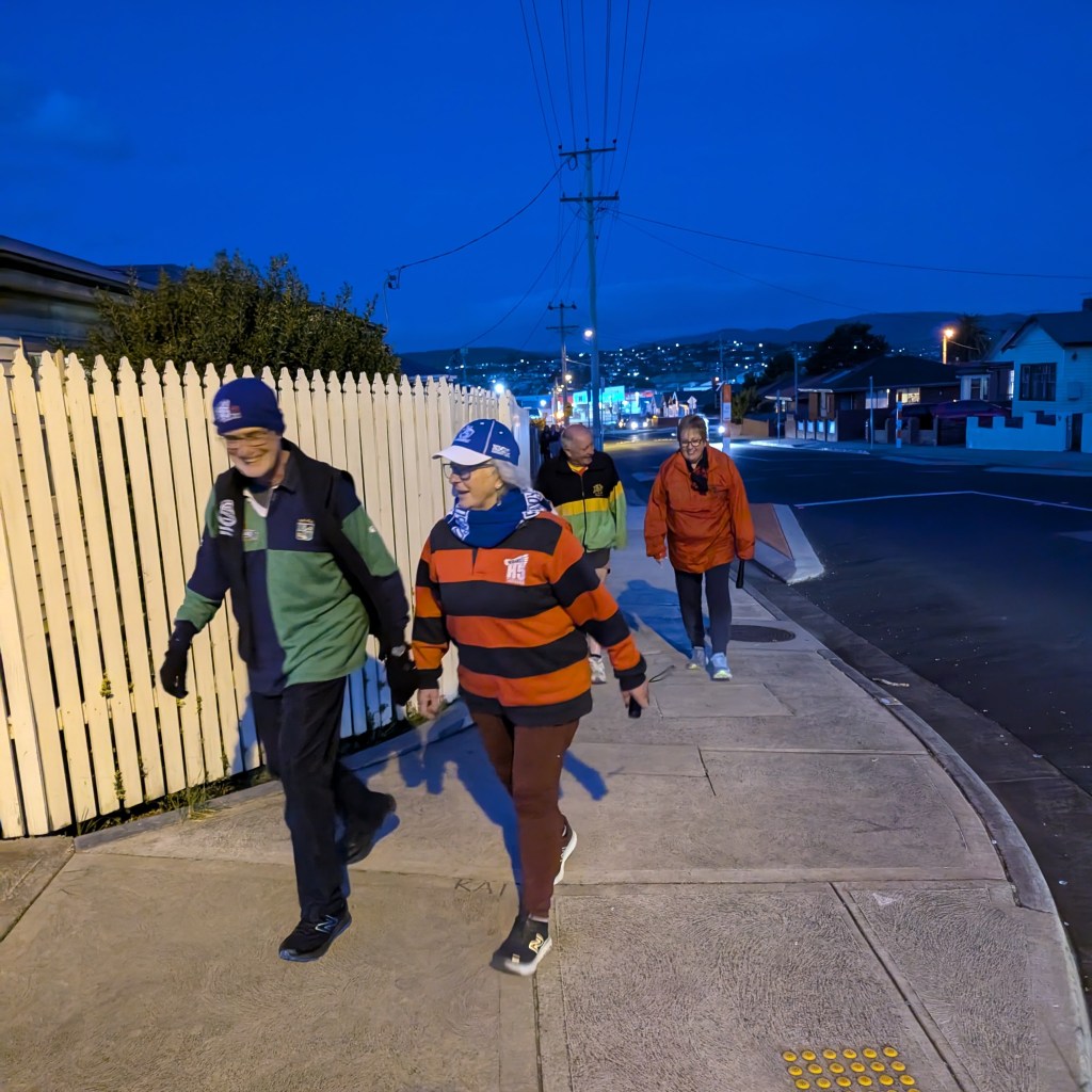 I’ve never really understood the religion of football. Carn the Wombats! But at least one H5 Hare, at this time of each year, will feel the call to offer a footy theme run, where fans and fake fans (it’s easy to identify the fake fans because they don’t know who wears their Club’s Number 1 guernsey) gather, all decked out in their Club’s colours. And so it was for Next Week’s Run 2300 from the Moonah Hotel.