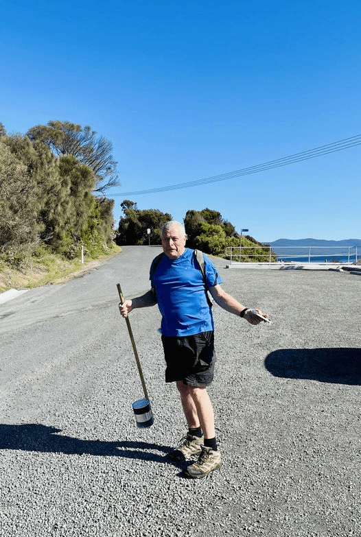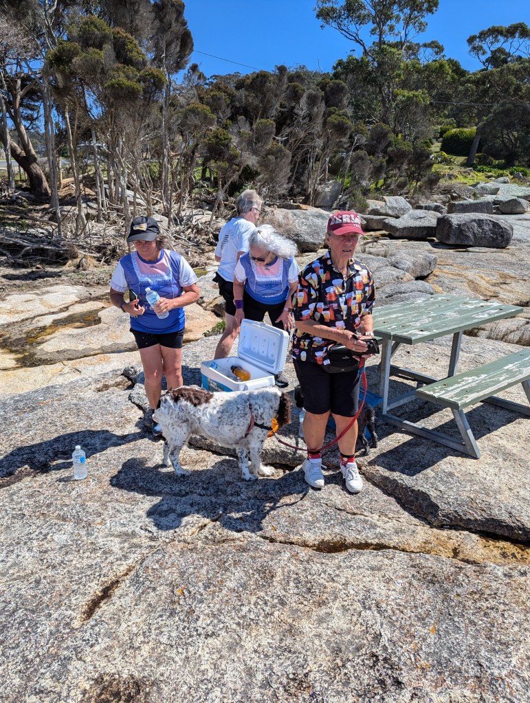 There were some weary faces at Breakfast.  Can’t Stop had overindulged in big boy drinks the previous night. Refer to photo in the Trash for how he shaped up next day. Promptly at 10.00 a.m. (morning time, Griz) ITR gave a quick chalk talk and pointed to Whalers Lookout.  An easy stroll up the two lookouts followed.  Expansive views of Bicheno and surrounds were enjoyed by all but the very hung over.