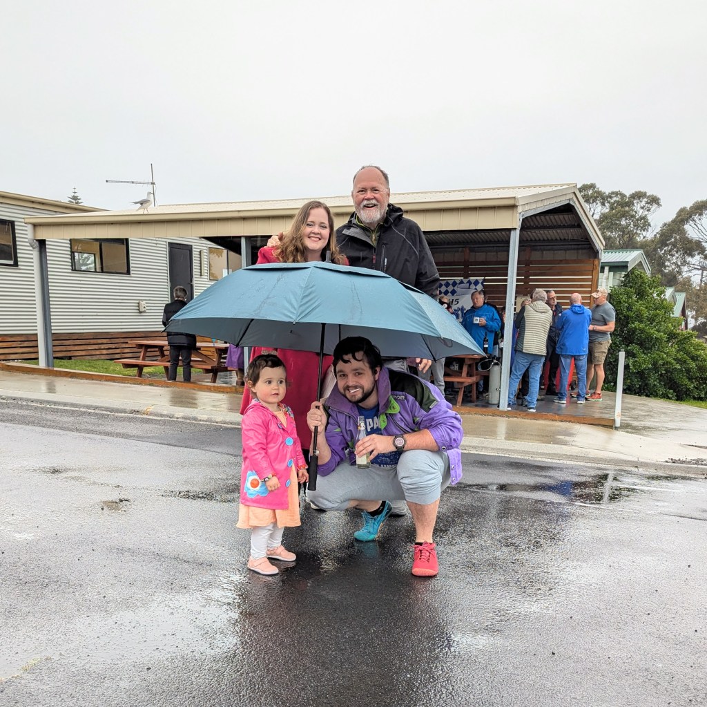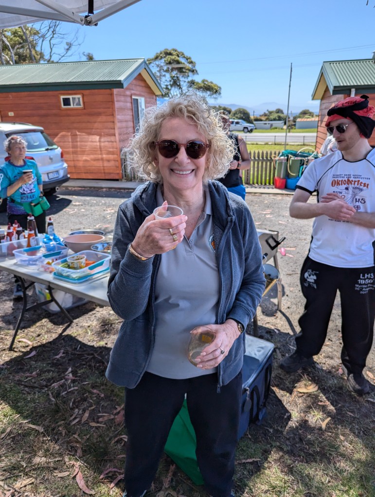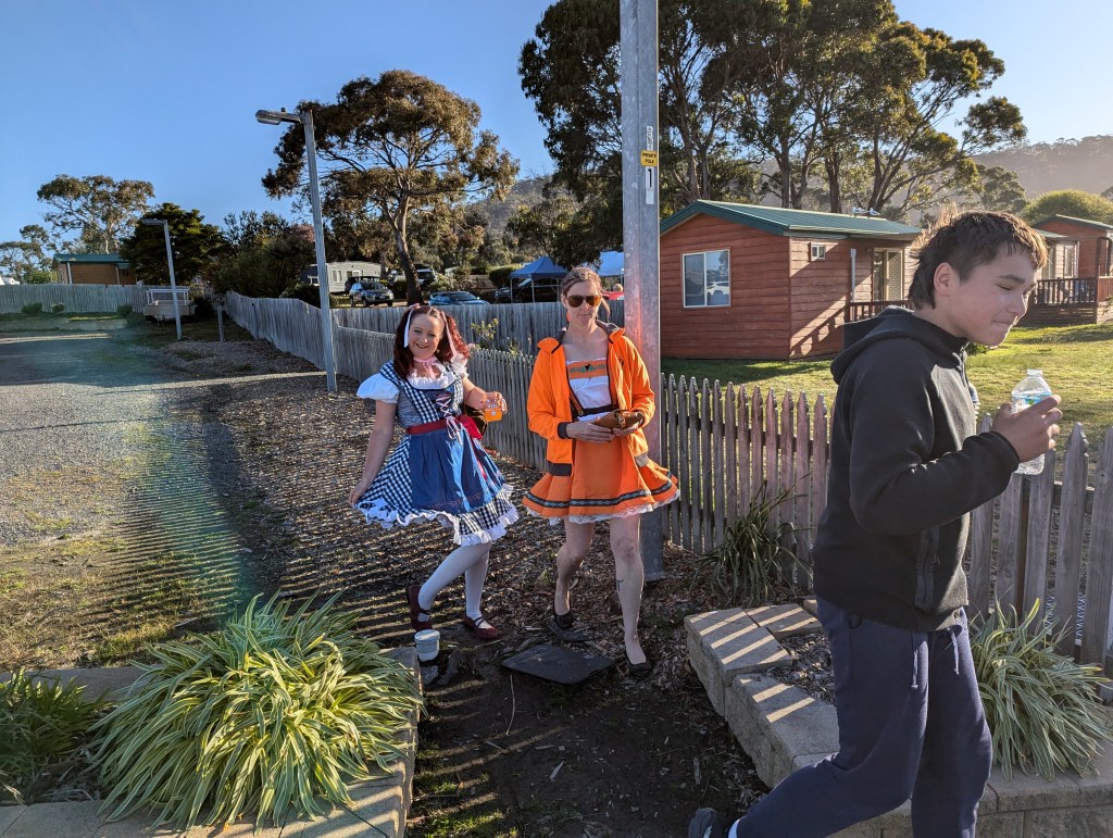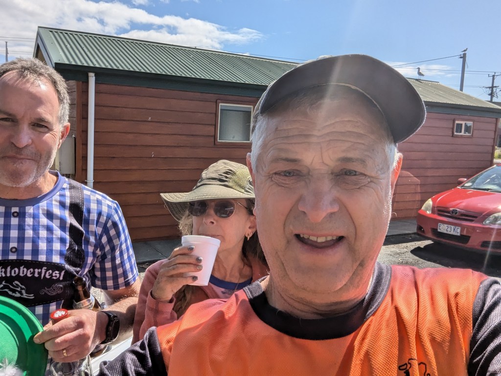 Things did not look promising during the trip to Bicheno on Friday afternoon.  It pissed down. The further north I drove from Hobart, the wetter it got.  The forecast did show some promise, with weather clearing overnight, but when I got to Bicheno East Coast Holiday Park that evening, it was teeming.   I found a cheerful and slightly wobbly ITR, together with his PA, Blah Blah Blah (henceforth known as B3) handing out welcome packs in the covered BBQ area. After booking in and setting up in a very cosy cabin, I joined the gathering throng of hashers who were imbibing in the BBQ area.  It was good to meet hashers that I had not seen for a while.  There was a sizable contingent of regulars from the north of the state. This included an Oktoberfest virgin, Blueprint from LH5 and a ring in, Nurse Rachet, from WA who on being in Bicheno, heard that a hash weekend was on, promptly paid the entrance fee and joined in.
