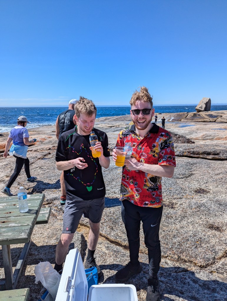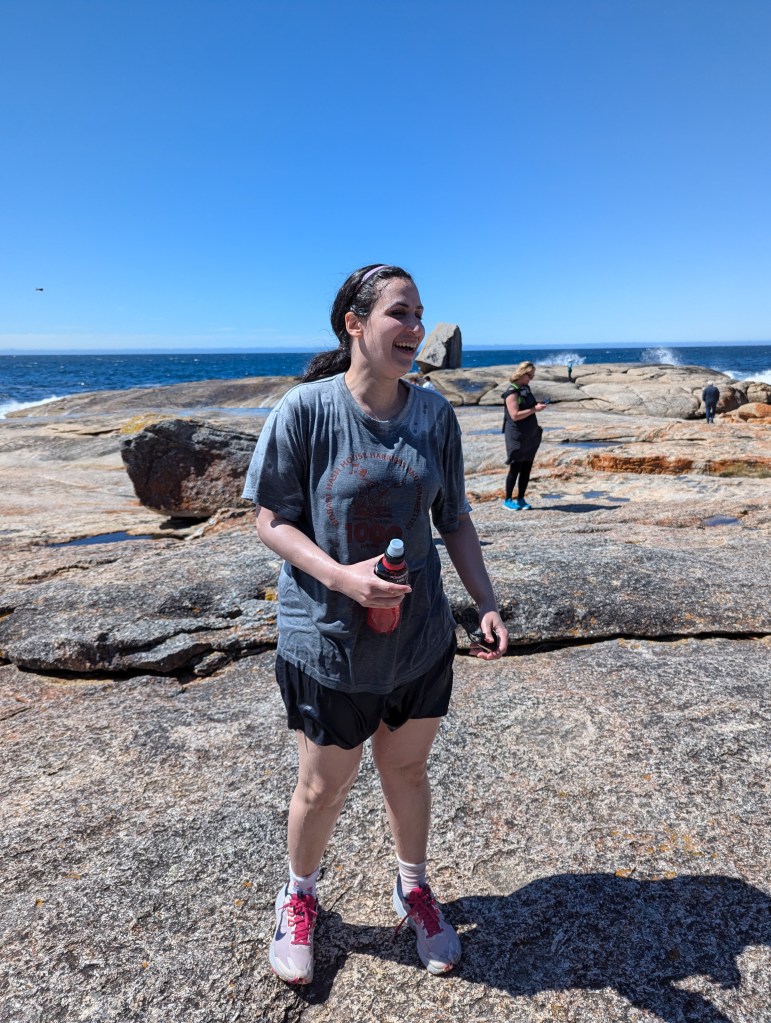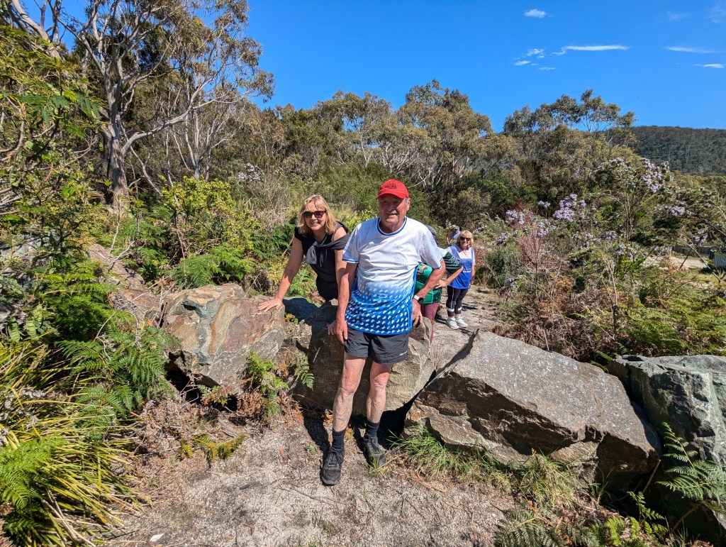 After rehydrating, we left ITR behind and continued to follow the coastal trail north. With a good swell running, the coastal walk was a delight. Big waves crashing on the rocks and a gentle breeze blowing made for a lovely walk.  The vistas were wonderful. The trail wound its way along the coast, past the Gulch, around Peggys Point and then headed back along the shore of Waubs Bay to the beach of the same name and back to the On On.  ITR had not finished with the runners yet.  A split sent them north again to Lynnes Point along the coastal track and then, after a quick loop, back along Foster Street to the On On.