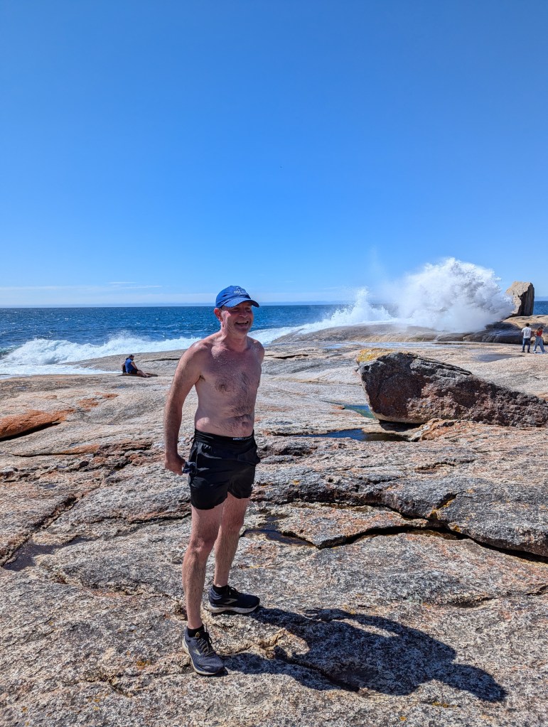Back on the main drag, Burgess Street, the NDIS split off for a gentle toddle along the flat. Walkers and runners turned north, heading into Bicheno and then through the bush, up and over the Lookout Rock State Reserve before swinging south to join up with the NDIS.  Thereafter, the trail, with a few twists and turns through streets, wound its way down through coastal heath to Rice Beach.  Here the leader of the pack, NDIS suprermo, Spoof, managed to surprise two young ladies who were sunbaking topless.   Seeing the haggard, chain smoking, homeless male stumbling towards them, both quickly gathered their belongings and fled.