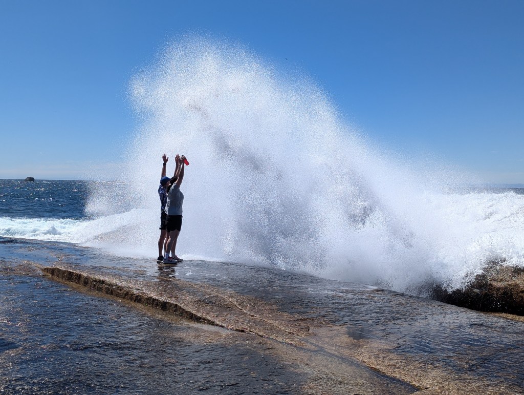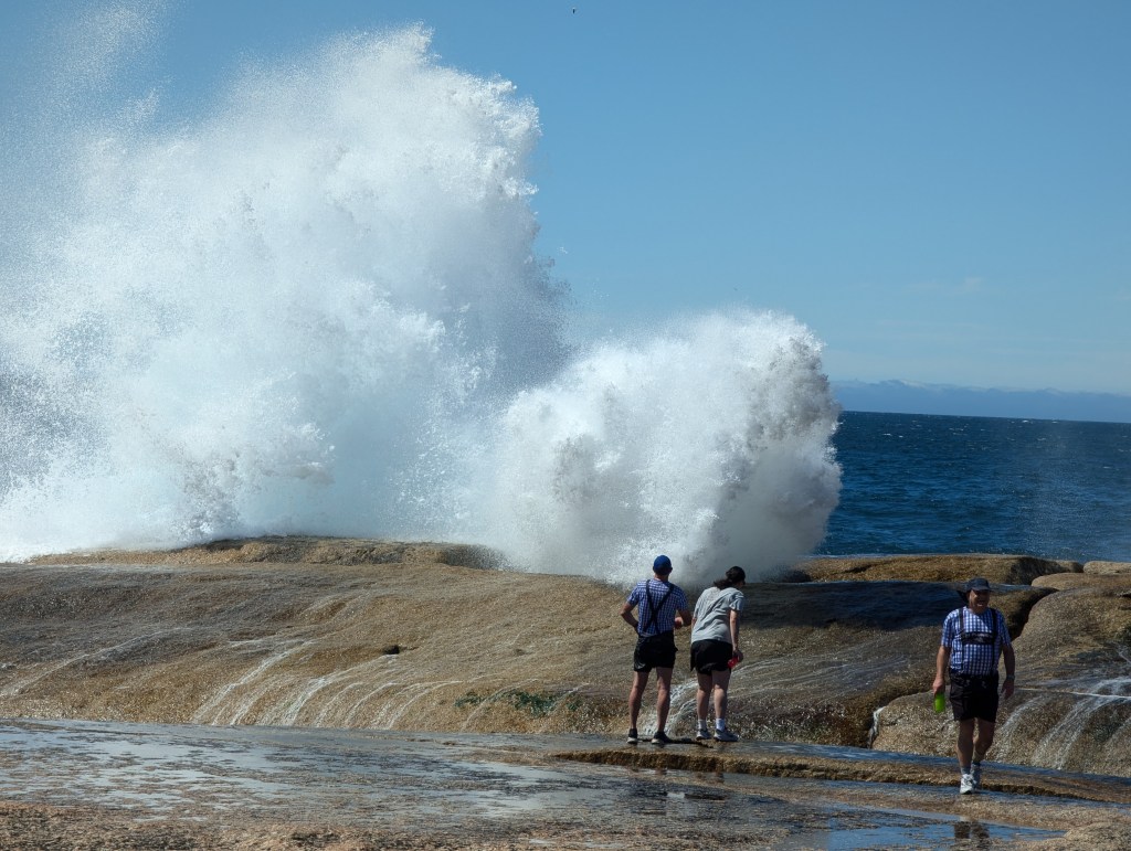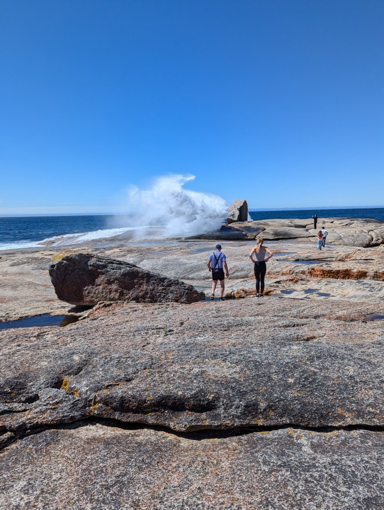 The trail now followed the Bicheno coastal track north.  Near the famous Bicheno Blowhole, the pack stumbled upon ITR sitting beside an esky full of cool water and drinks.  This was the first time in a very long time that people were happy to see ITR.  A number of hashers could not resist the temptation to stand as near the blow hole as possible.  A cracking swell from the southeast had huge plumes of water being thrown skywards. Lord Limp, sans shirt, and others could not resist the temptation for soaking.  Magic Touch and Sir Eve took part in an impromptu wet T shirt competition; Magic Touch won by the length of the strait.