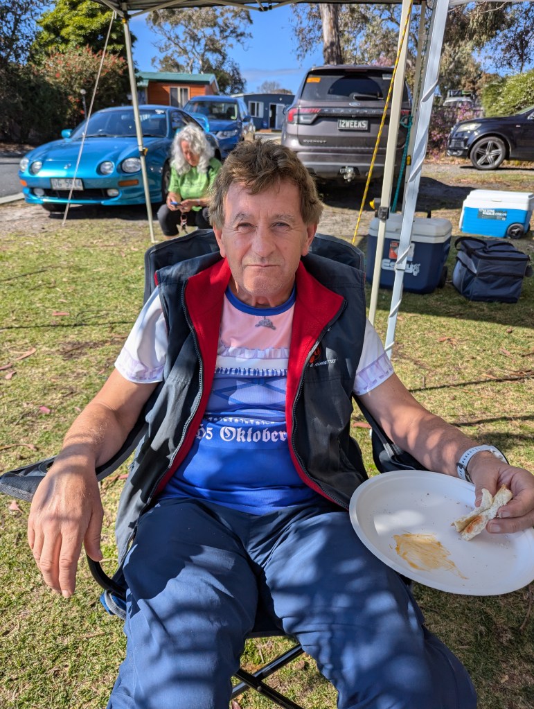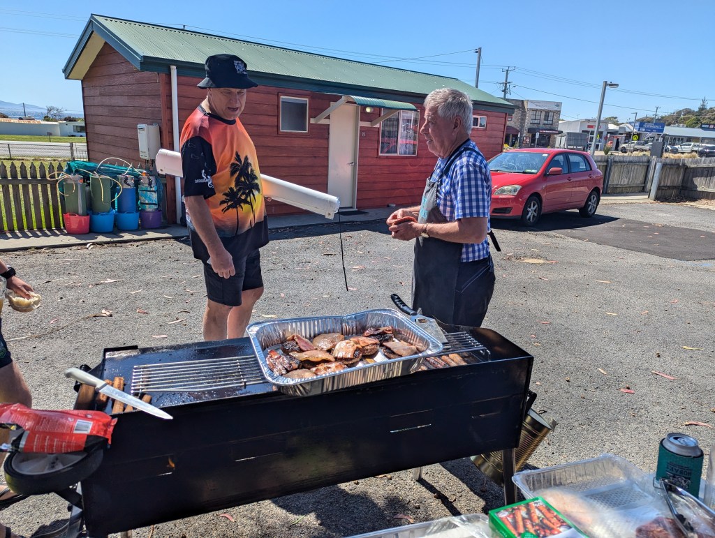 Blue sky greeted everyone the next morning. There was not a cloud to be seen and a gentle  sou-easterly zephyr was blowing.  Forecast temperature of 20 degrees was well on its way. At 10.45 a.m. the pack gathered in the common area near cabin 7.  Marquees provided shade, chairs had been assembled and the BBQ was ready to go.  JM, Bad News, had assembled a skillful works crew and had them erecting all manner of structures.  Thanks to Viagra, Lord Limp, Jerk Off and others for their help in assisting and maintaining erections.
