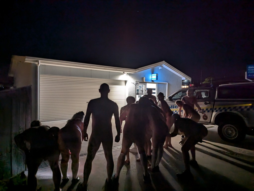 15 hashers took part in the clothing optional run. Assembling in Cabin 5, everyone disrobed, had a shot of schnapps and out the door following ITR, the live hare. A quick photo opportunity outside some non-descript government building in Champ Street and back to the On On to the surprise of a passing motorist who had to do a U turn and have another look.  ITR presided over a quick circle, more schnapps consumed and nearly everyone got a skol.  Back to cabin 5, more drinks, clothes back on and out the door.