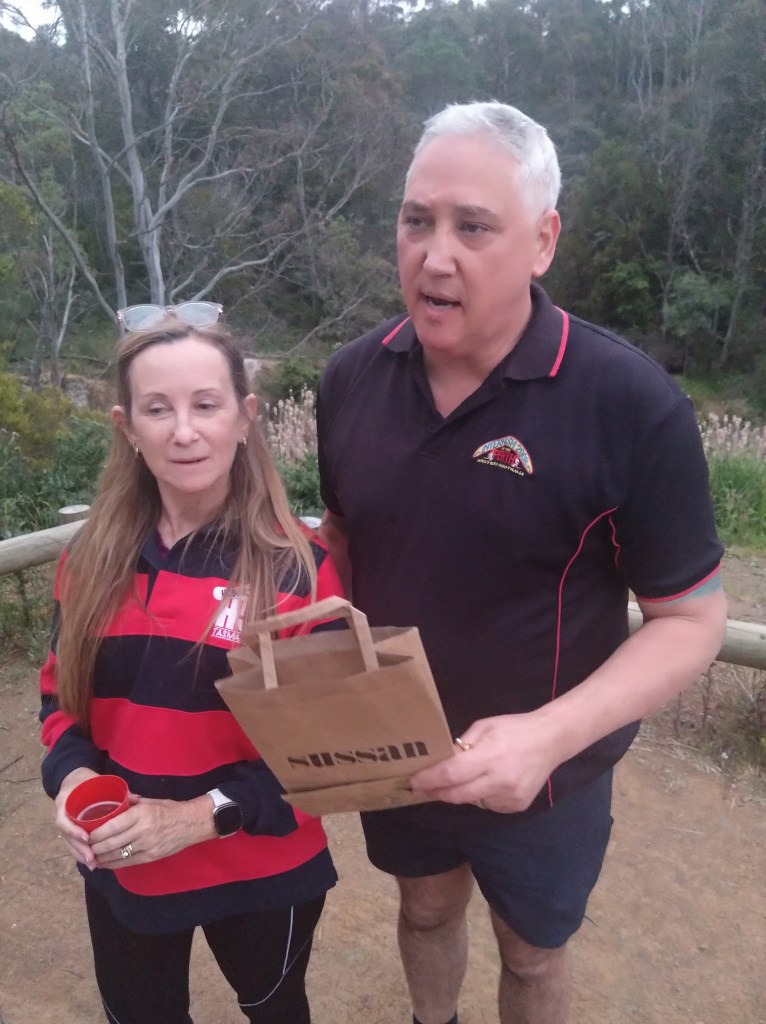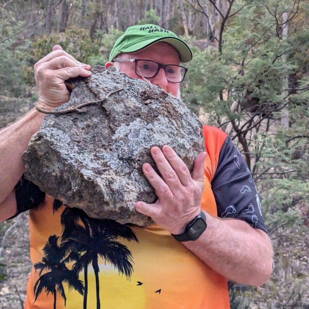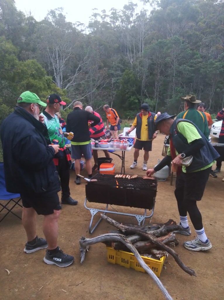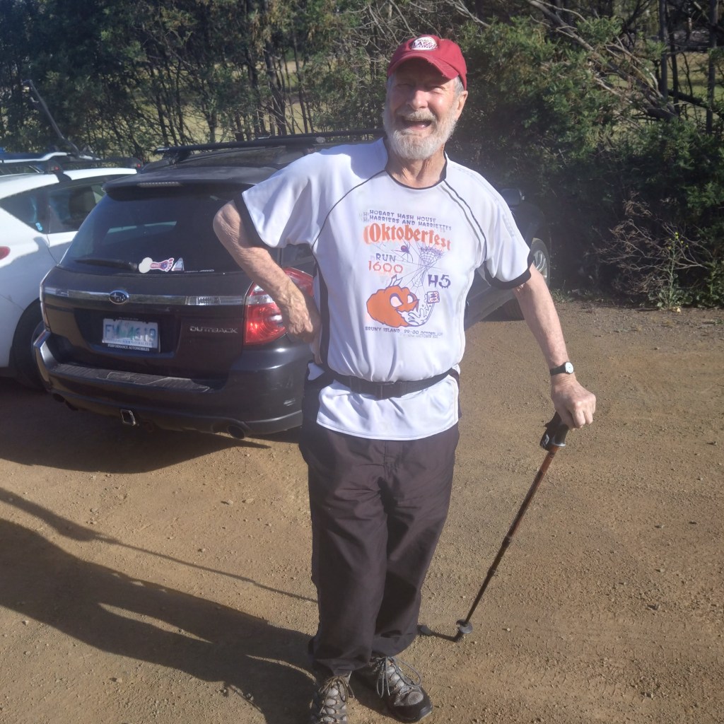 Ratu Steady Eddie, repository of all sorts of archaic Facts, alerted me to some interesting history. At the end of Belbins Rd during World War II, in the area known as Stringy Bark Gully, or Airforce Gully, or Redgate, was a top-secret bomb store. We passed some remaining foundations along trail. Those Hashers who are also members of the Hobart Walking Club can read the story in that club’s Tasmanian Tramp No. 40 from 2014.