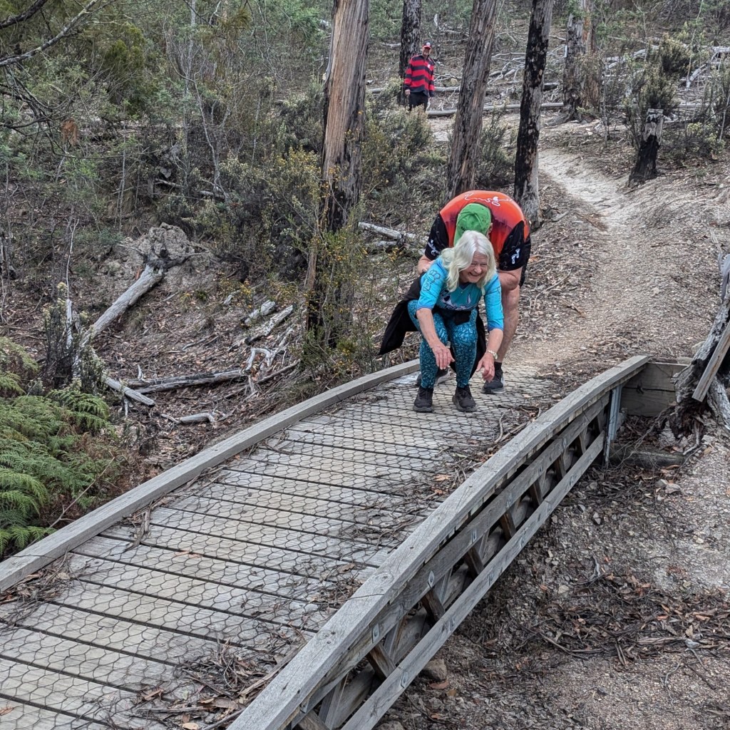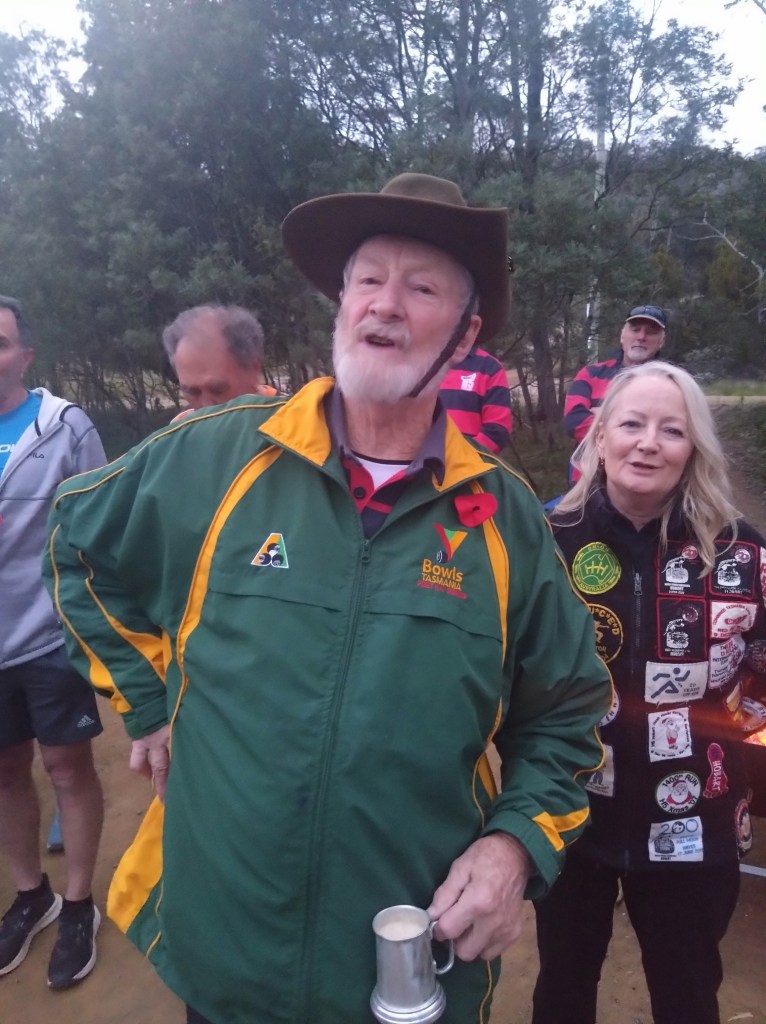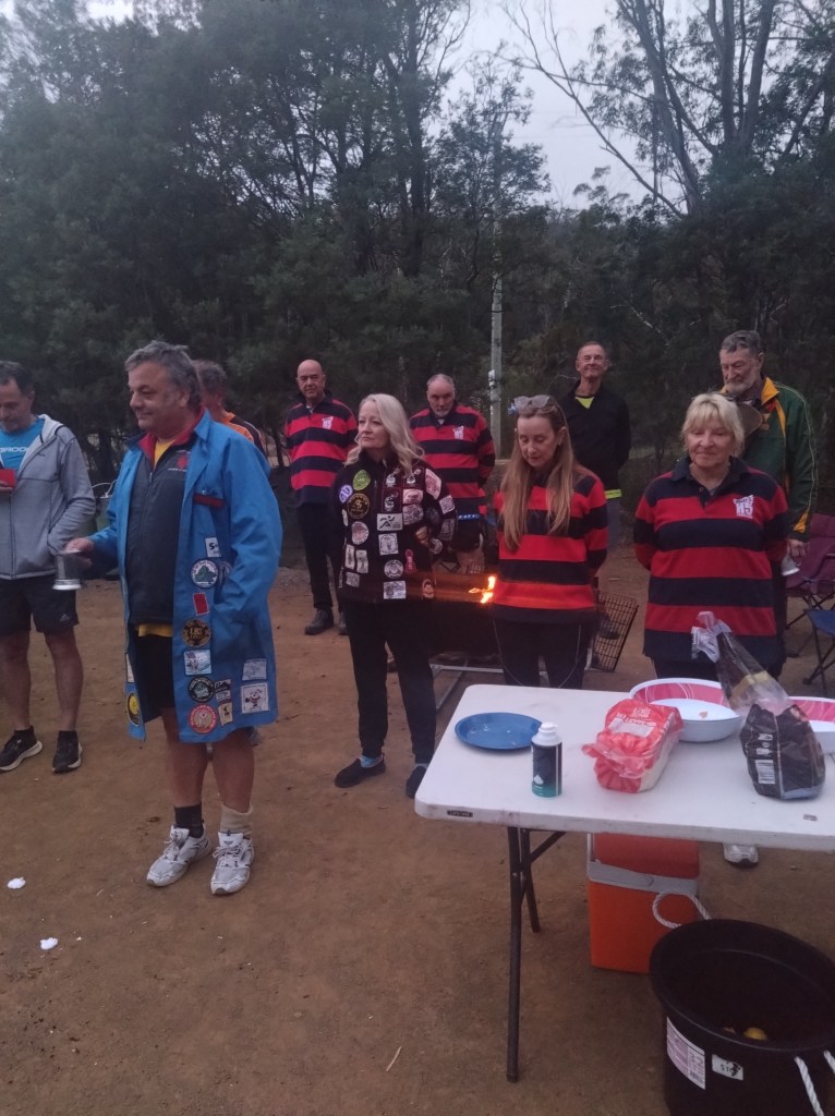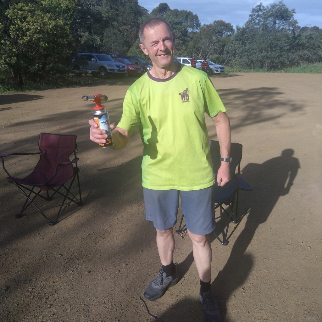 Ratu Steady Eddie, repository of all sorts of archaic Facts, alerted me to some interesting history. At the end of Belbins Rd during World War II, in the area known as Stringy Bark Gully, or Airforce Gully, or Redgate, was a top-secret bomb store. We passed some remaining foundations along trail. Those Hashers who are also members of the Hobart Walking Club can read the story in that club’s Tasmanian Tramp No. 40 from 2014.