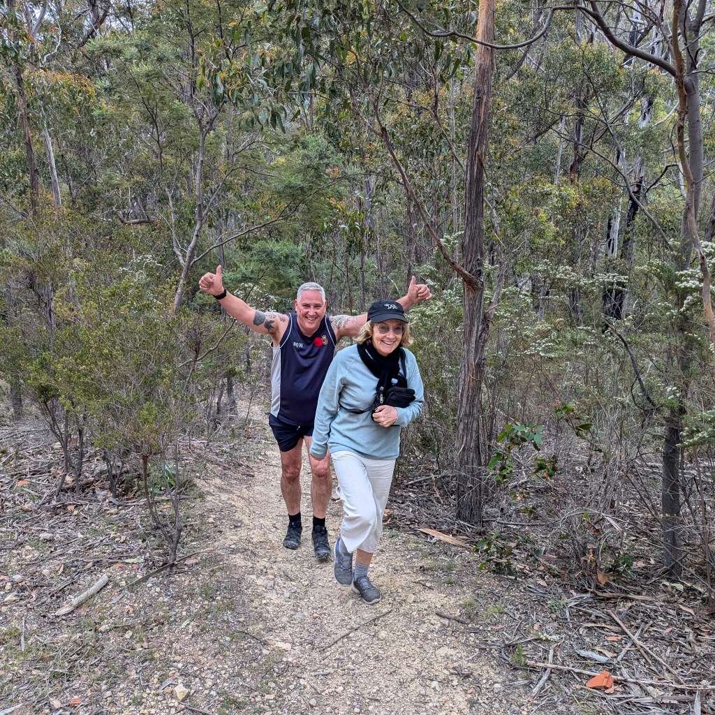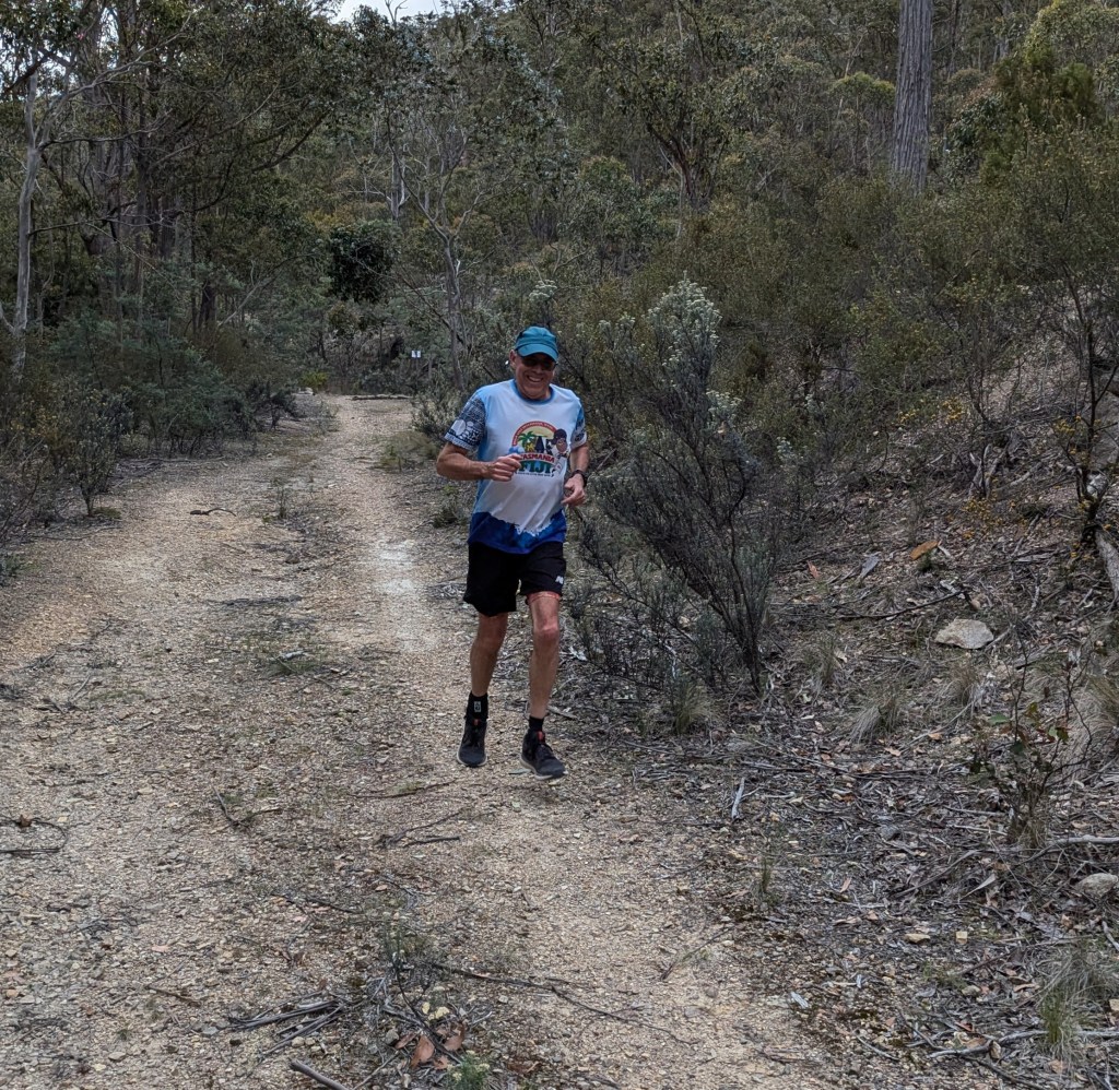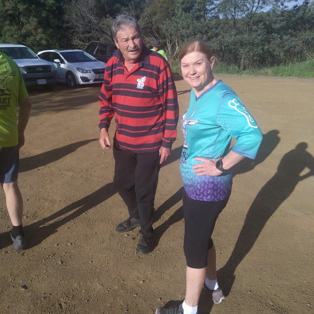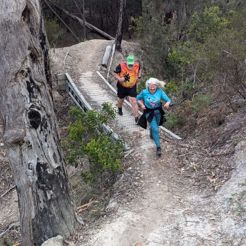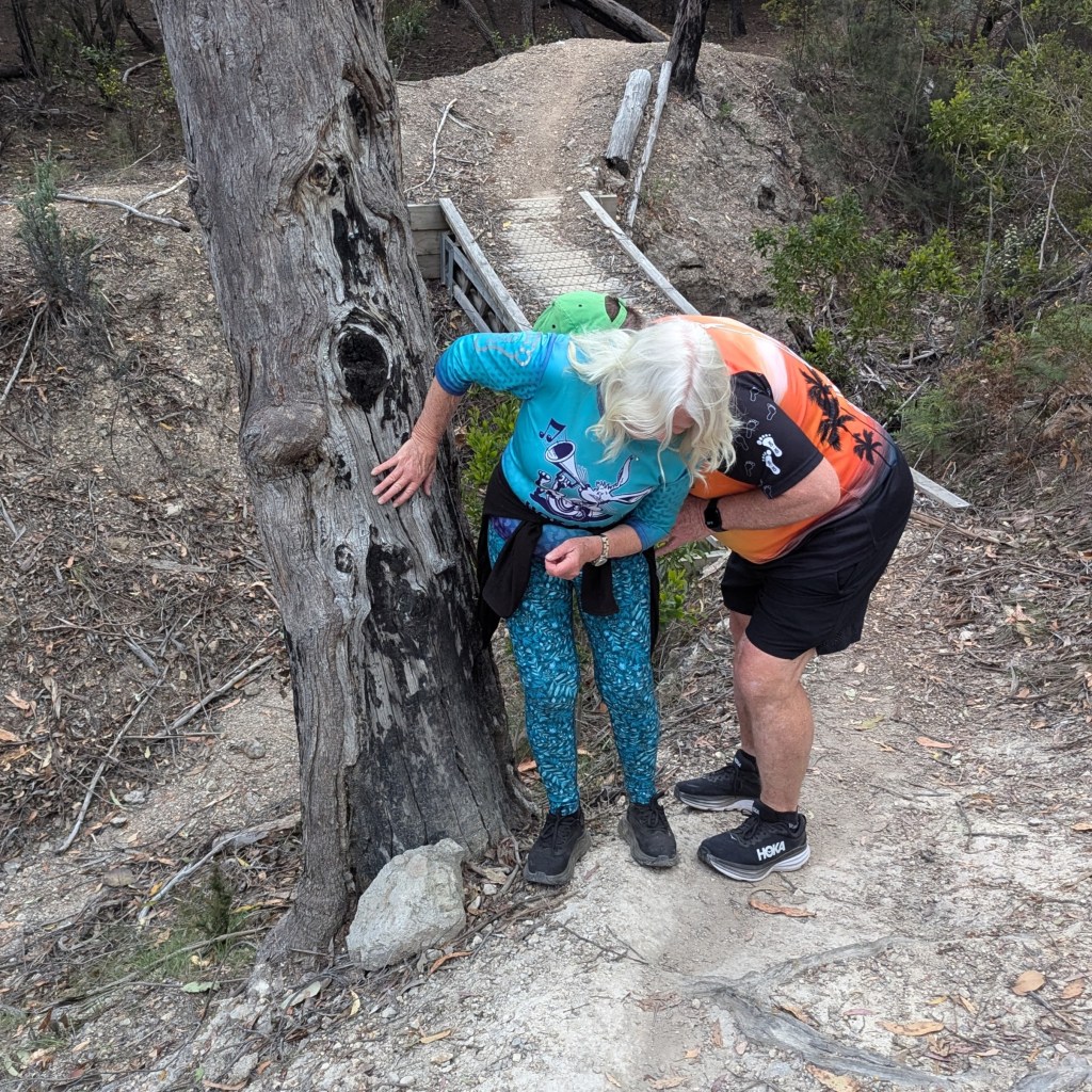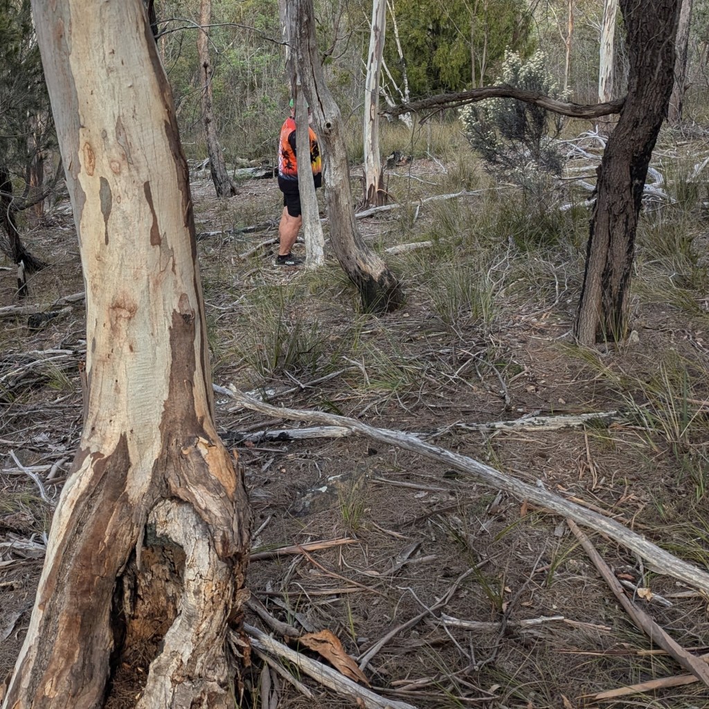 This was true: we found cute trail arrows sitting in excavated ant hills behind craftily erected barriers of sticks and stones. And the return trail passing a couple of metres away. Still, trail was easy to follow – not even Just Kidding and Big Bang could possibly get lost. There was bush. There were birds. It was flat. Fact! The walkers’ trail was just under 4kms. The runners must have done several clever loops as they passed the walkers from time to time.