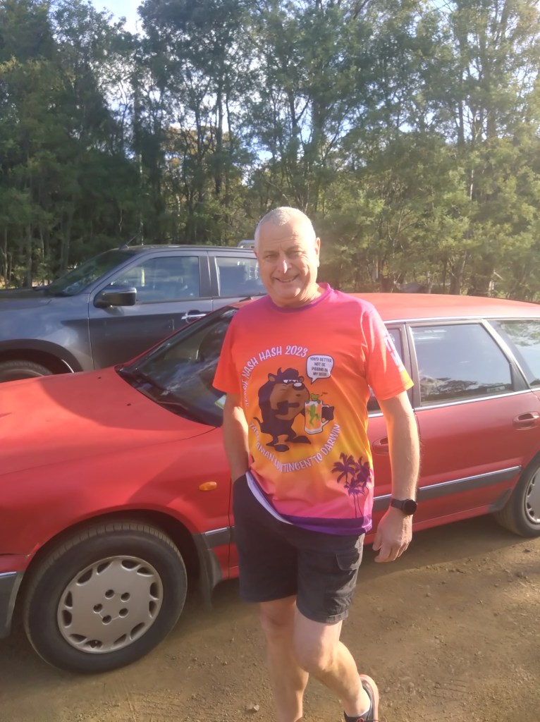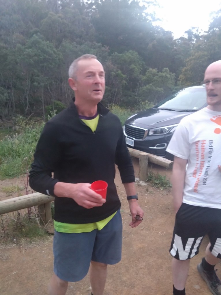A Belbins Rd trail without calf-cramping hills? Without giant, Hasher-devouring mosquitoes? Had we slipped into an alternative universe? No, just a carefully crafted Next Week trail. There had been no need for Lone Arranger to boycott the run in memory of previous experiences. There had been no need for Bad News to travel as far as Scotland to avoid the run. Although Bad News was keen to be with us in spirit, as illustrated by his photo below.