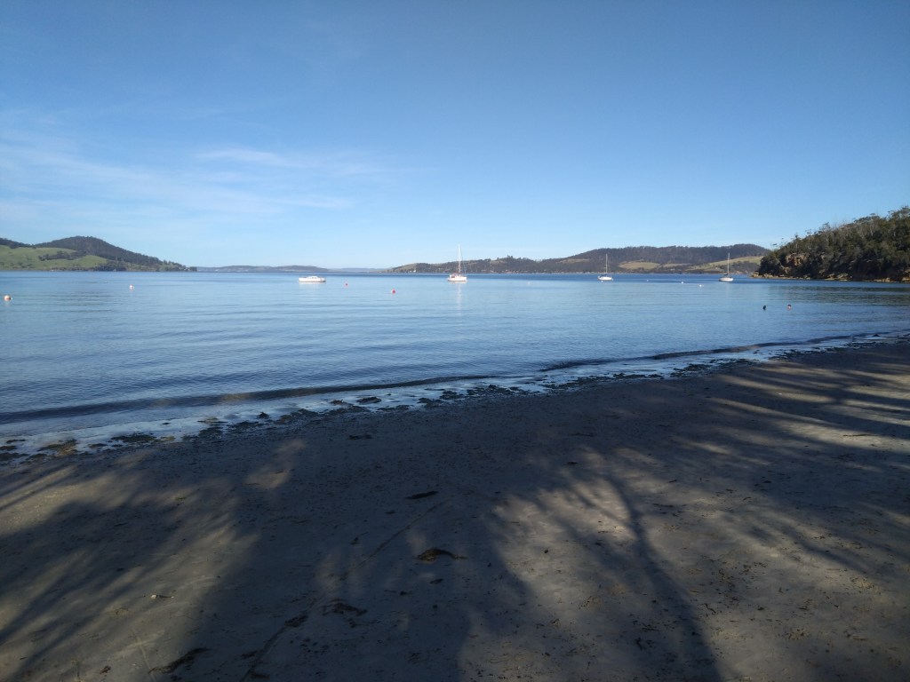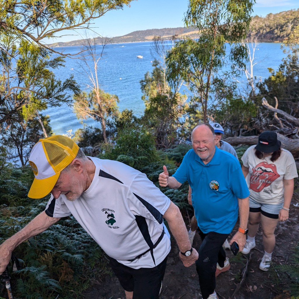 Trail contoured around the slopes of Sheppards Hill until the one and only (and very well marked) runners/walkers split. Cracker generously resisted the temptation to take the runners to the top of Sheppards Hill, instead continuing to contour around the slope until turning toward the coast at Snug Point. Here, the hare’s huge ‘Cave Stop’ sign invited Hashers to pause and admire the cave. Runners then followed the picturesque coastal track, with views out to a tranquil North West Bay, back to the On On. The walkers, meanwhile, meandered downhill through some cunning bush trails to join the runners’ trail on the coastal track for a short stroll back to the beach.