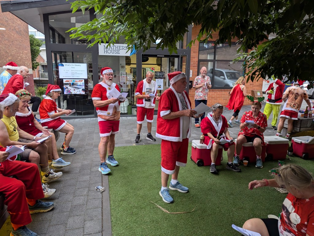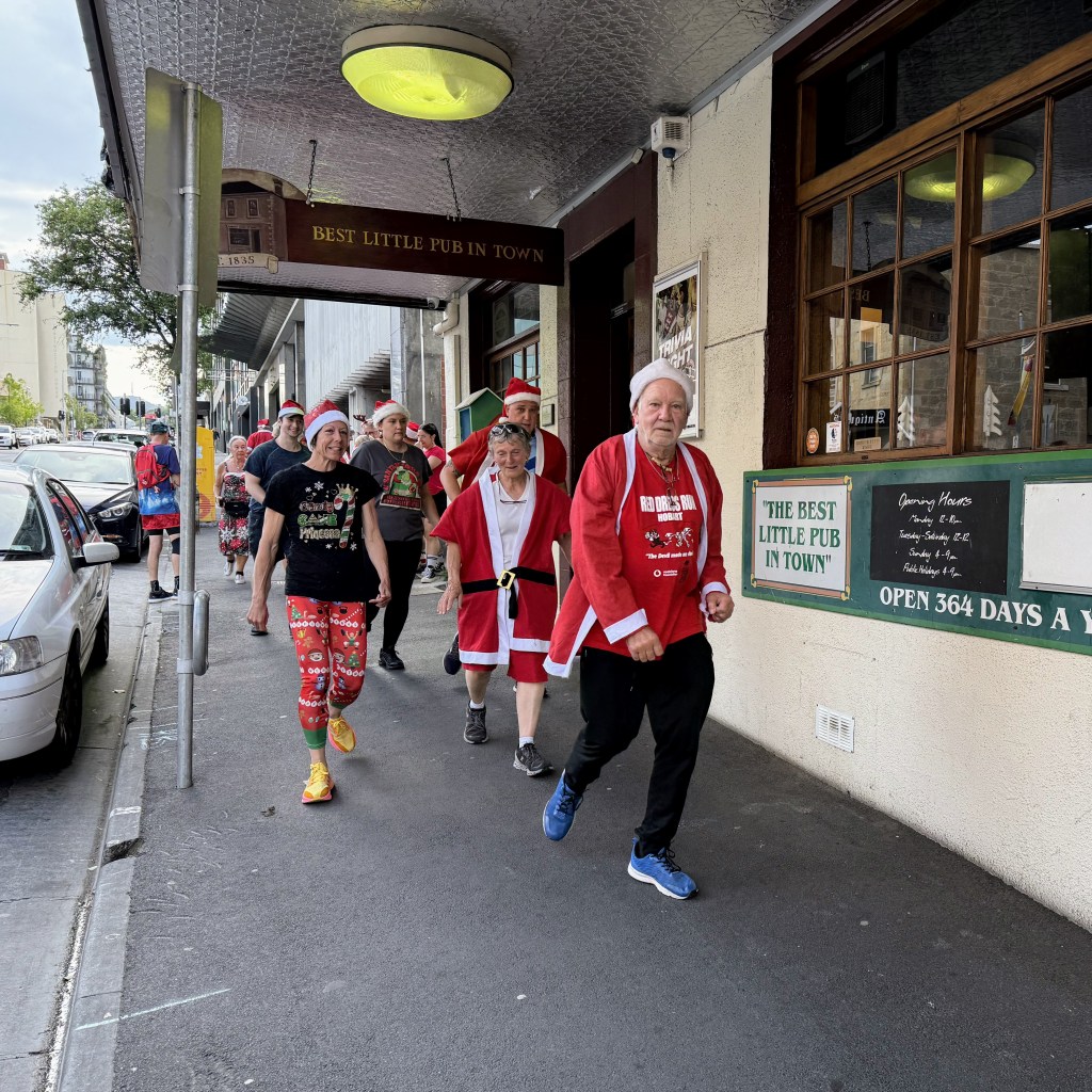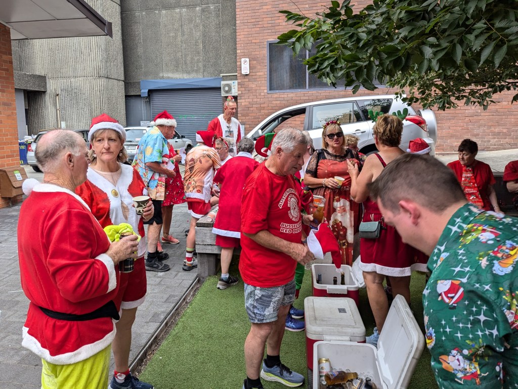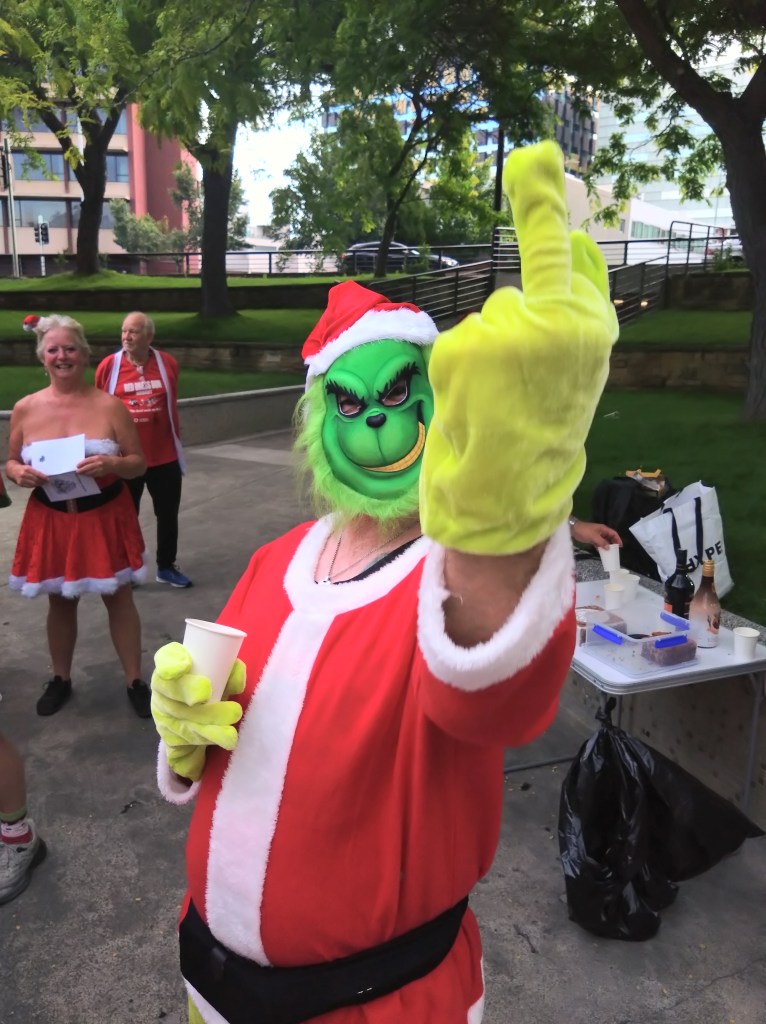From the Workers Club, trail headed north up Elizabeth St, then wended its way, with a third runners/walkers split, to the third Piss Stop in a little park next to the State Library. So many Santas en masse inspired the drivers of a fire engine to set their sirens blazing. The occupants of a cop car watched in bemusement as a sea of red crossed the road on a red light. Spoof, marching to the tune of a different drum, was generally somewhere other hashers were not. Stunned Mullet did most of the trail on a scooter. Sonar almost gave an innocent older lady a heart attack by bounding up to her with a bilious Grinch sound; at least he didn’t moon her, his party trick at Piss Stop 3.