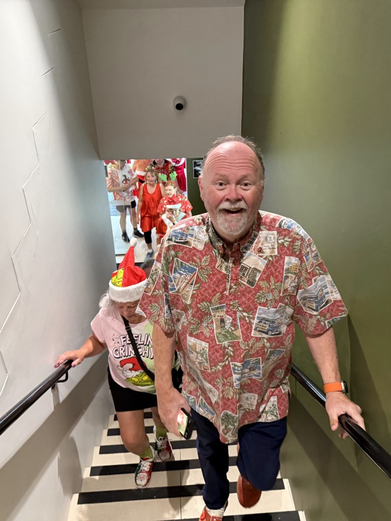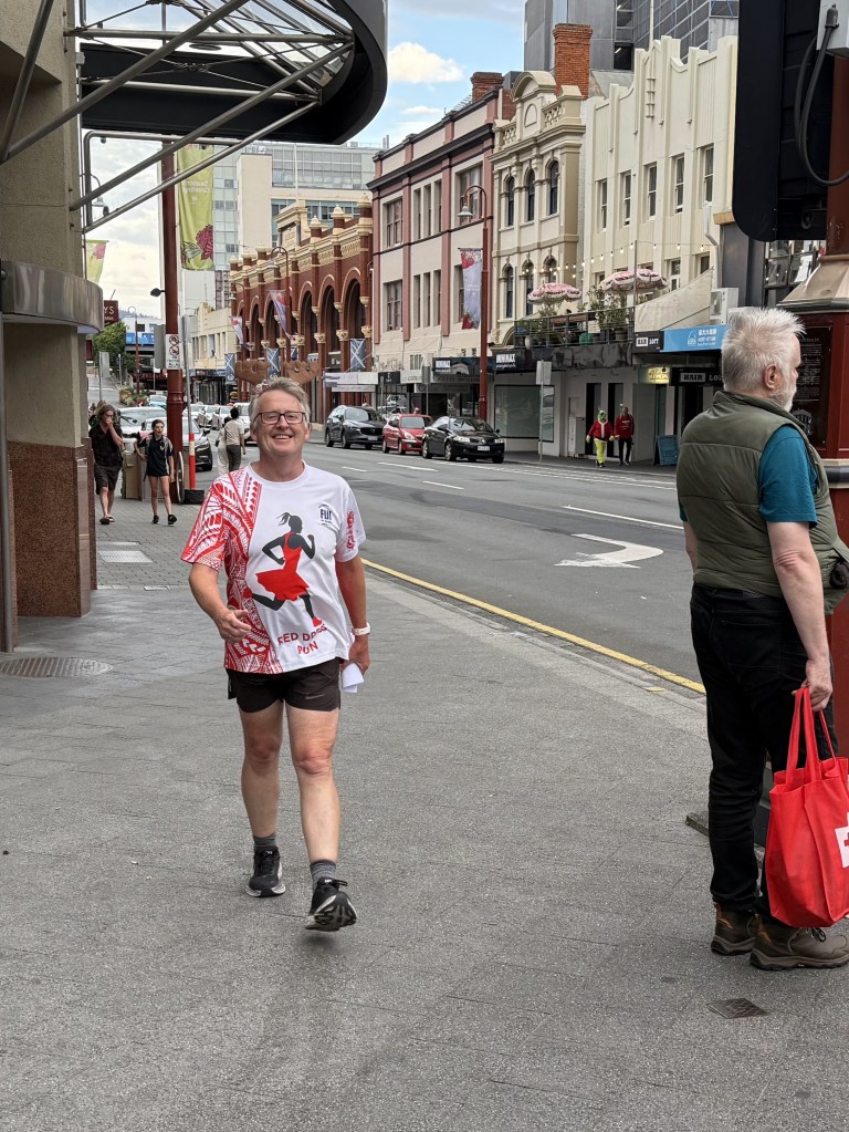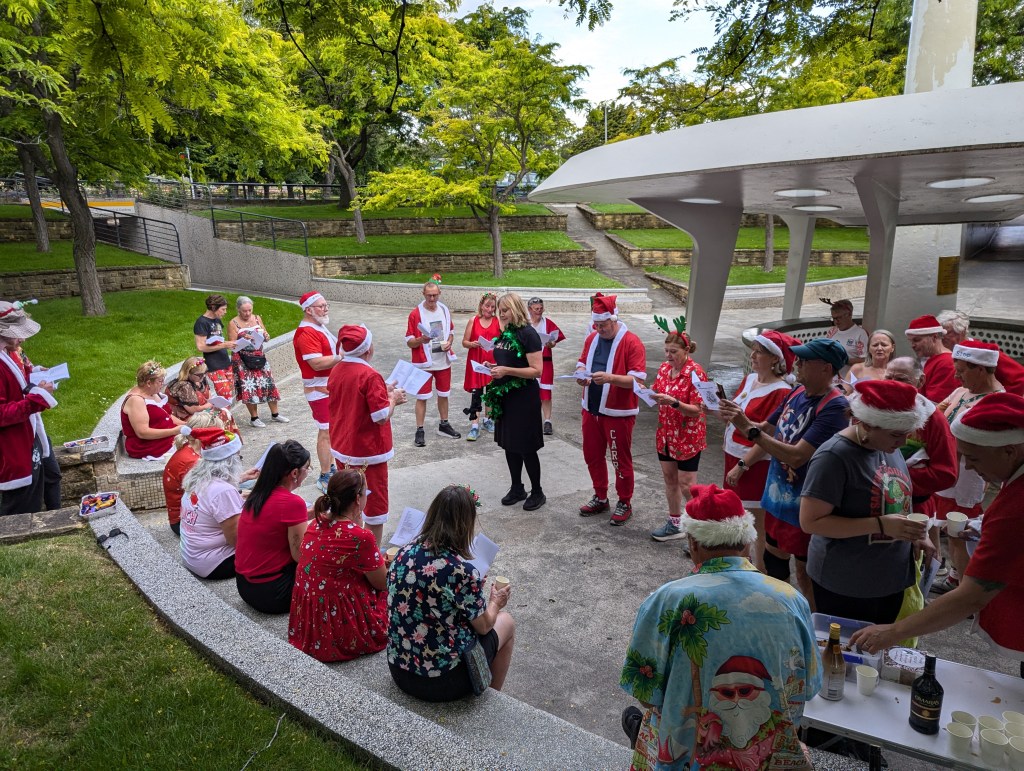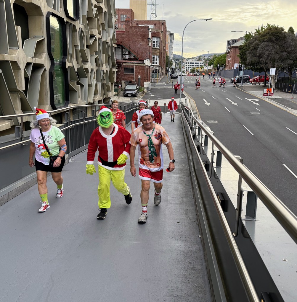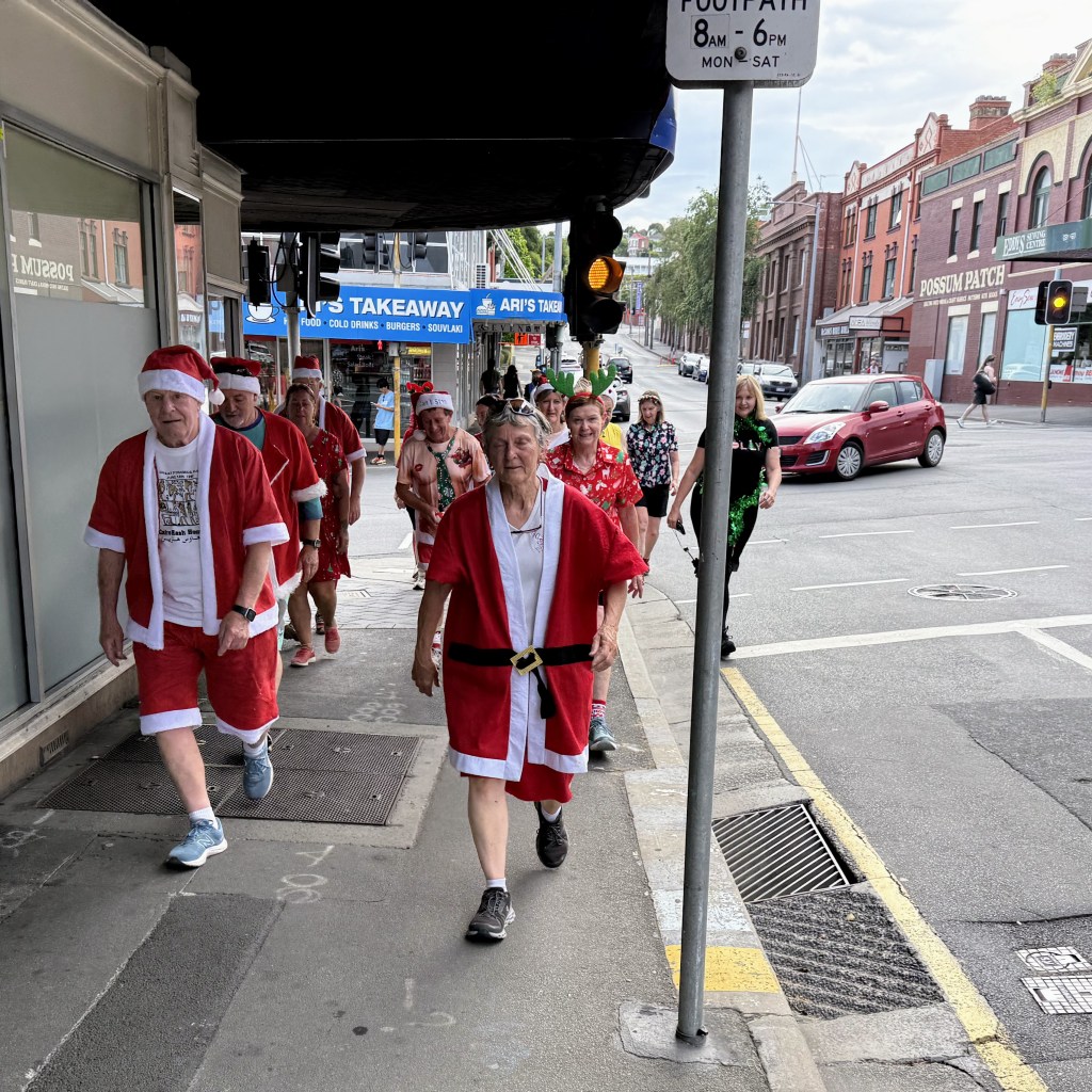 From the Workers Club, trail headed north up Elizabeth St, then wended its way, with a third runners/walkers split, to the third Piss Stop in a little park next to the State Library. So many Santas en masse inspired the drivers of a fire engine to set their sirens blazing. The occupants of a cop car watched in bemusement as a sea of red crossed the road on a red light. Spoof, marching to the tune of a different drum, was generally somewhere other hashers were not. Stunned Mullet did most of the trail on a scooter. Sonar almost gave an innocent older lady a heart attack by bounding up to her with a bilious Grinch sound; at least he didn’t moon her, his party trick at Piss Stop 3.