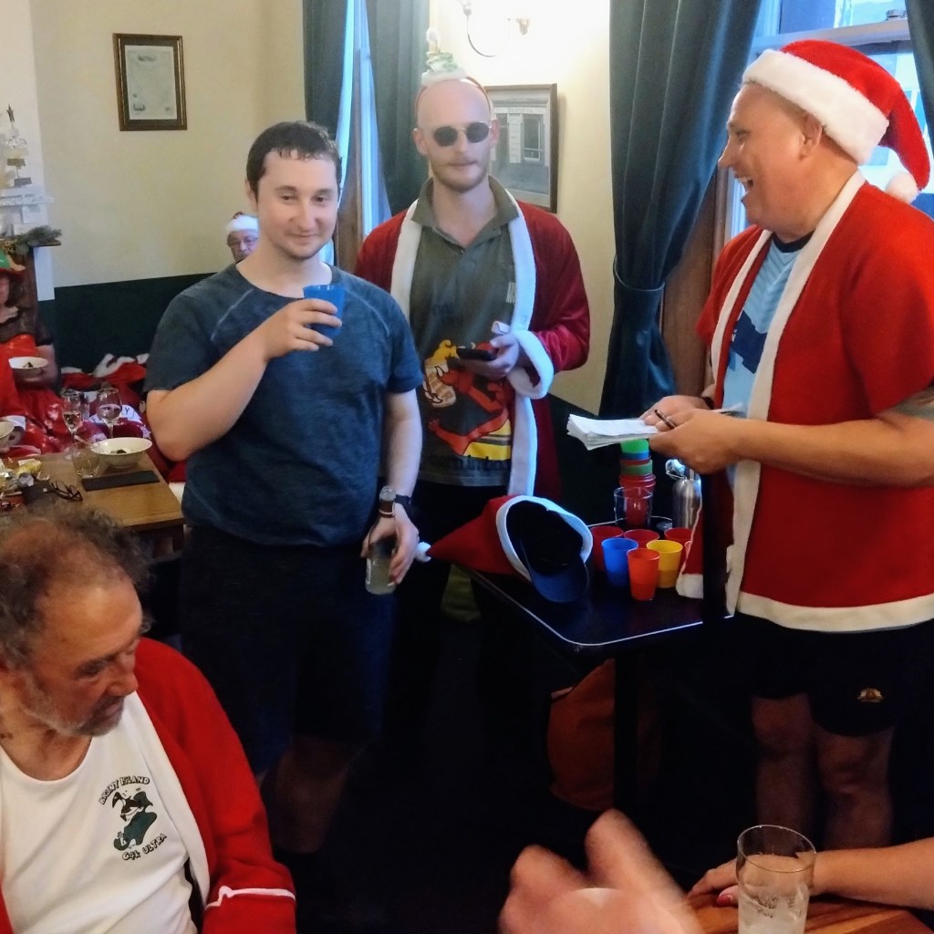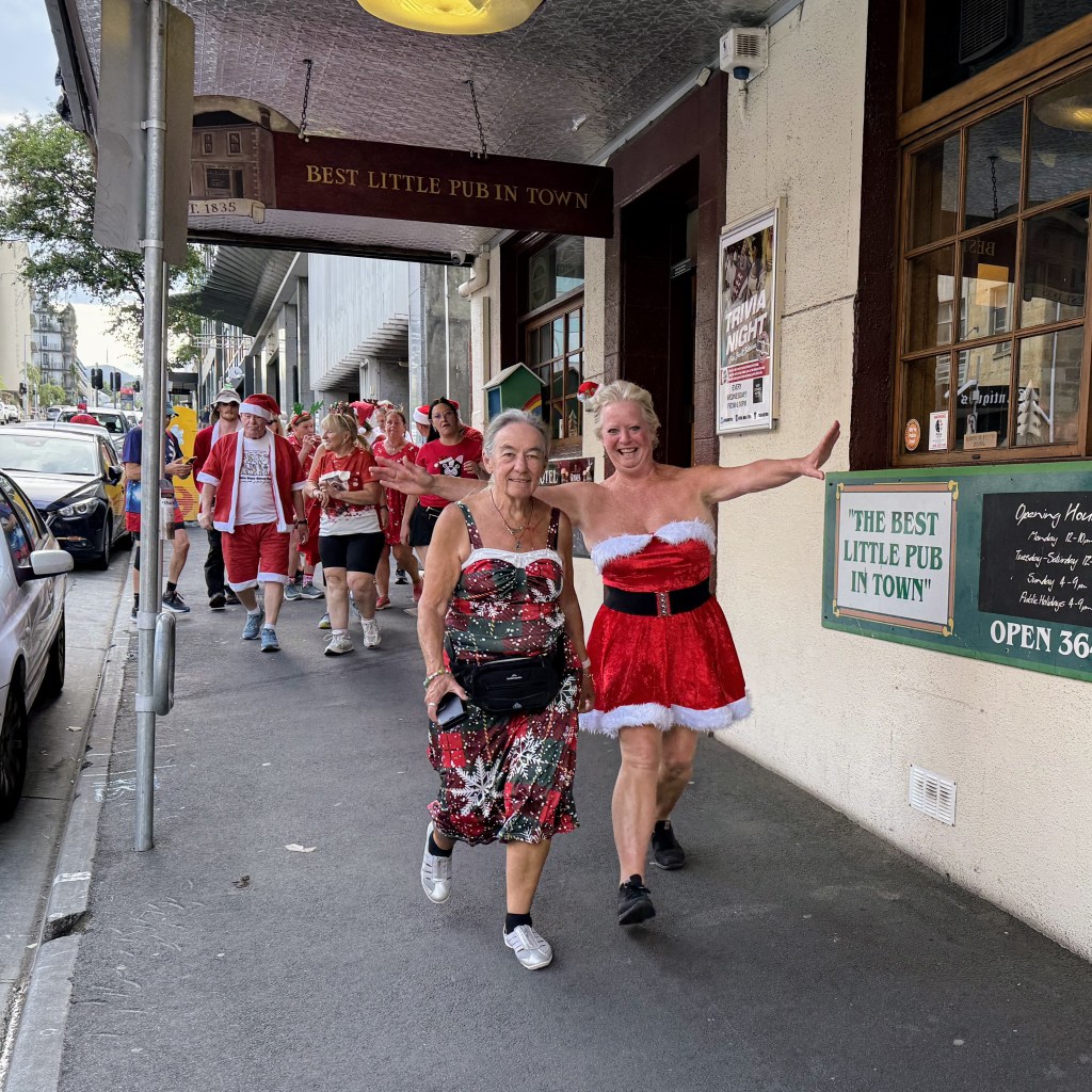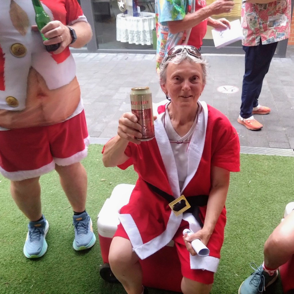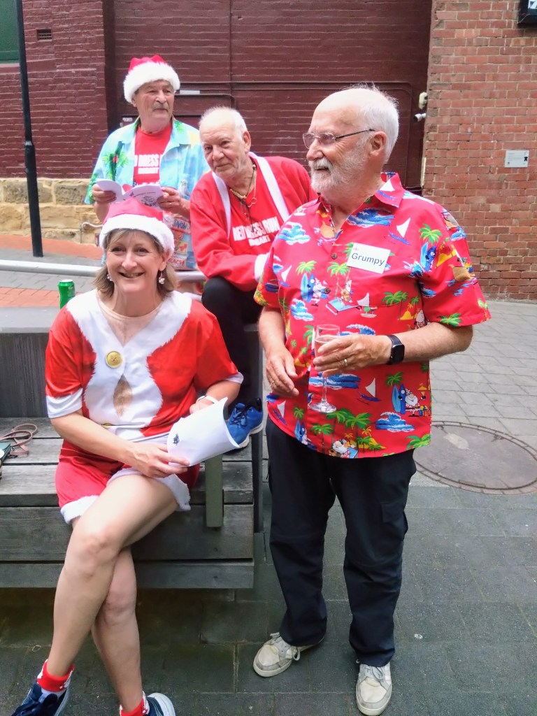 Finally, ITR called time, so everyone p#ssed off to the New Sydney over the road for dinner and Christmas shenanigans. Yes Please went down in an attempted dramatic exit. Dinner came, Christmas fare of turkey and ham followed by Christmas pudding. The Lip session came (this was carefully timed to fit with Santa’s coming, but Contessa Coupla Weeks decided at the last moment to deliver a skoll via a long and winding tale reminiscent of Ratu). Santa came (a bit delayed), and Hashers sat on his capacious lap while he handed out presents with suitably lewd comments. Gift of the night went to Lone Arranger: if you’re game, ask her what it was (this is really a test to check which of you b#stards read the Trash).