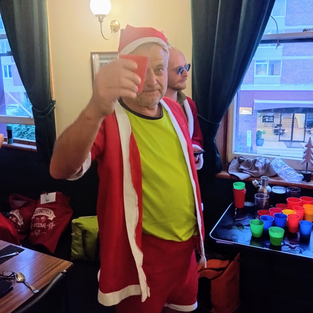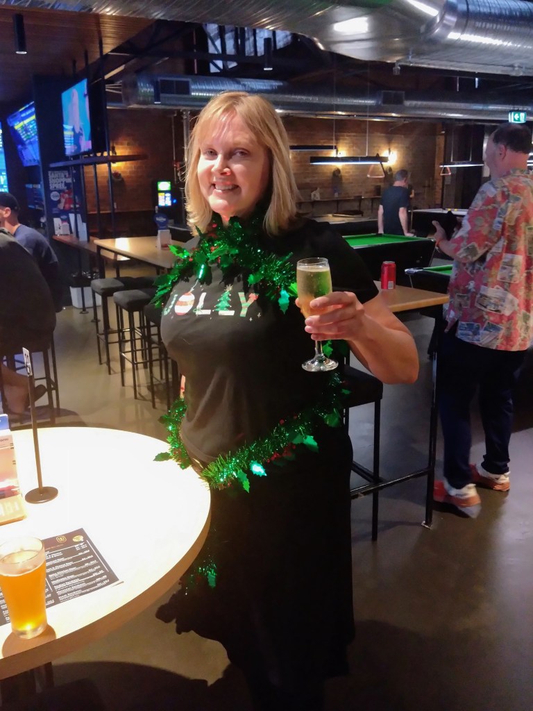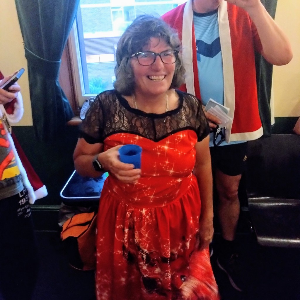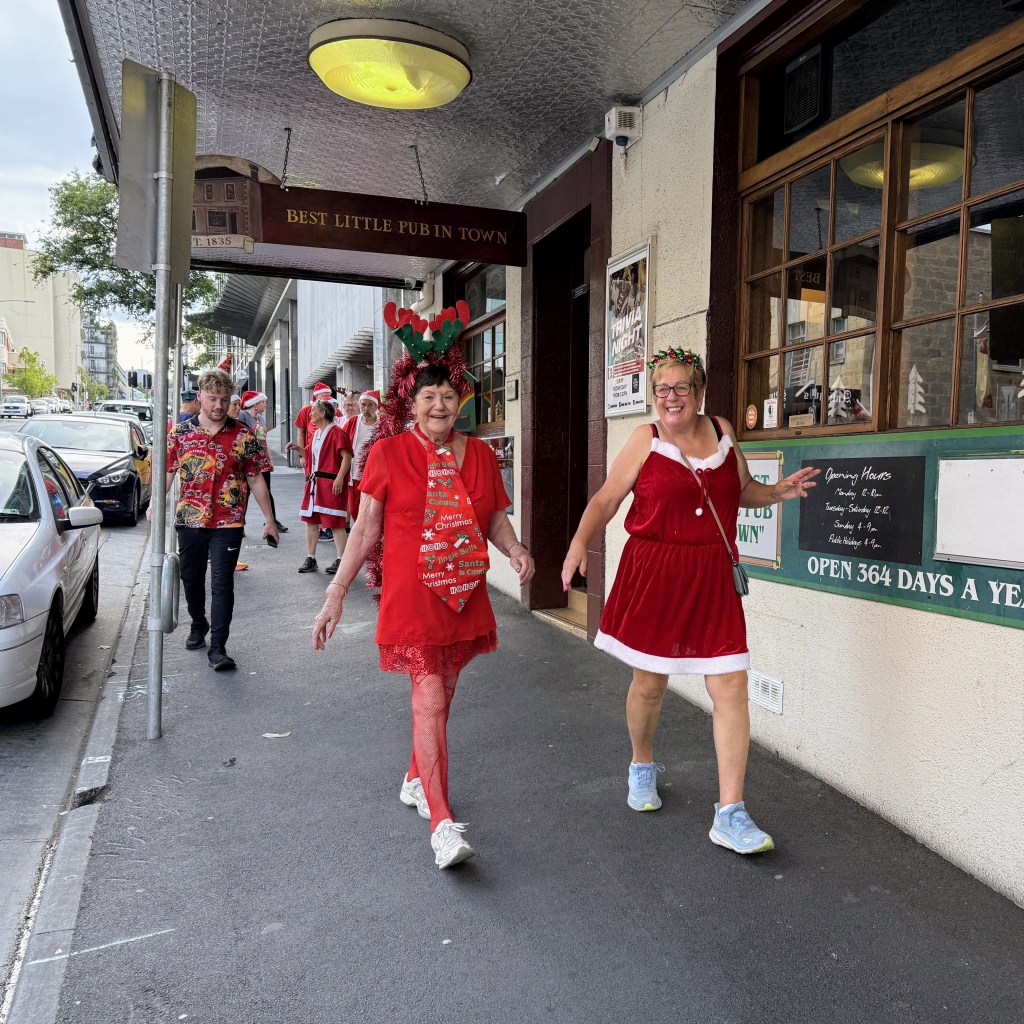 Finally, ITR called time, so everyone p#ssed off to the New Sydney over the road for dinner and Christmas shenanigans. Yes Please went down in an attempted dramatic exit. Dinner came, Christmas fare of turkey and ham followed by Christmas pudding. The Lip session came (this was carefully timed to fit with Santa’s coming, but Contessa Coupla Weeks decided at the last moment to deliver a skoll via a long and winding tale reminiscent of Ratu). Santa came (a bit delayed), and Hashers sat on his capacious lap while he handed out presents with suitably lewd comments. Gift of the night went to Lone Arranger: if you’re game, ask her what it was (this is really a test to check which of you b#stards read the Trash).