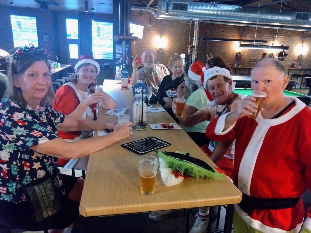 Gov’nor Honkers led a Hash carol session at the third Piss Stop, continuing what he’d started at Piss Stop 1. From the Gov’nor’s personal, unbiased viewpoint, this was an outstanding success. Some real people were interested in the spectacle, but I don’t think the Hash alternative lyrics registered with them.