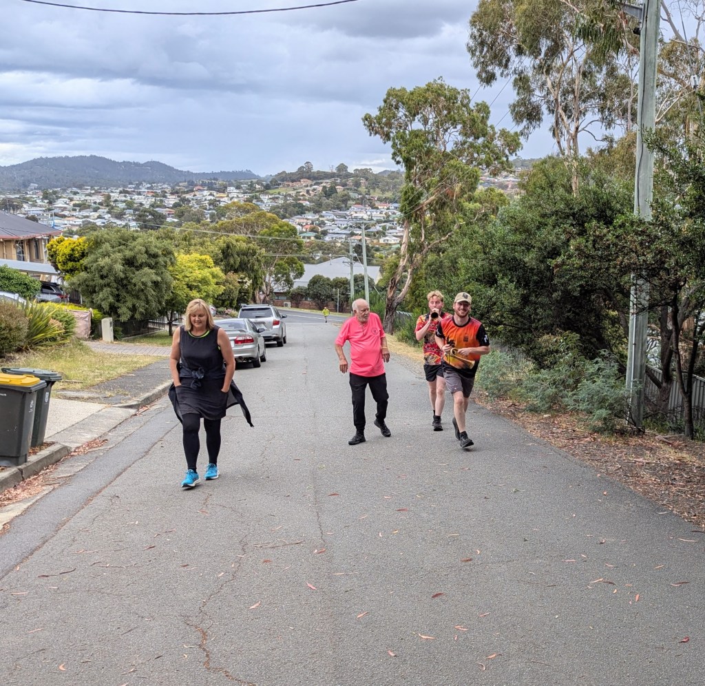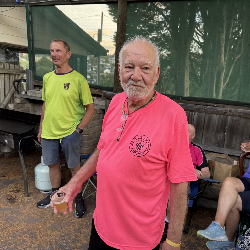 Crossing Gordons Hill Road, the trail headed into the old Rosny golf course area with the Burger Boys demonstrating their horn blowing abilities to great effect. A split in the bush had the runners heading off to who knows where, never to be seen again. The walkers wandered around in the bush a bit and then ended up in Marril Place at the top of Lindisfarne before descending St Helens Street. Spoof took one looked at the height that was to be lost, adjusted his pacemaker and said, “Fook that, I’m Hashing”. I was a bit worried about him, especially with the delights of the nursing home nearby, so went along to keep him company.