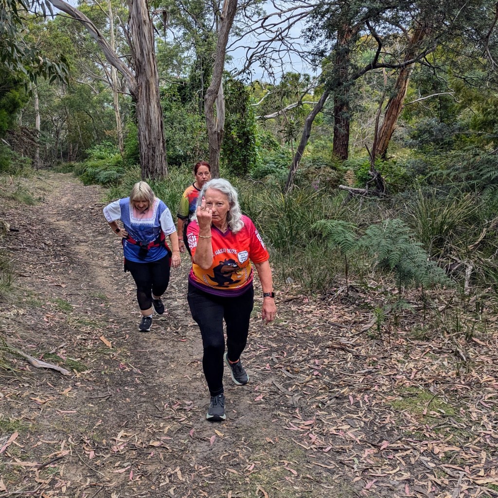The trail then entered virgin territory. It went through bushland behind houses in Gordons Hill Road and over a hill towards Warrane. While wandering along a bush path, we copped abuse from a local harridan who complained that we were on her land. The club’s chief negotiator and local government liaison officer, Sir Eve, tried to placate the old bag without much success. He tried to draw the belligerent old fools attention to the Boundary Fences Act 1908 but gave up in disgust when she wouldn’t stop rabbiting on about her land.