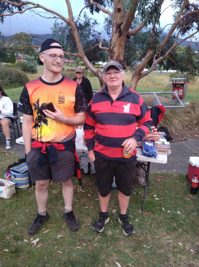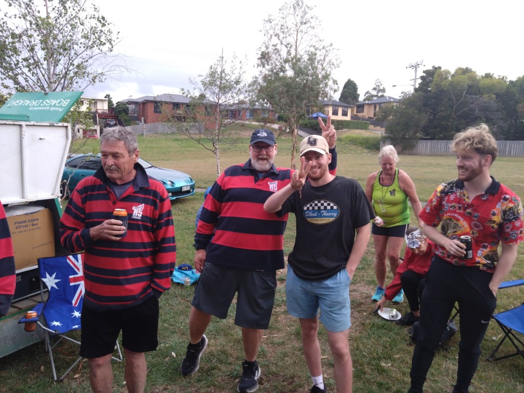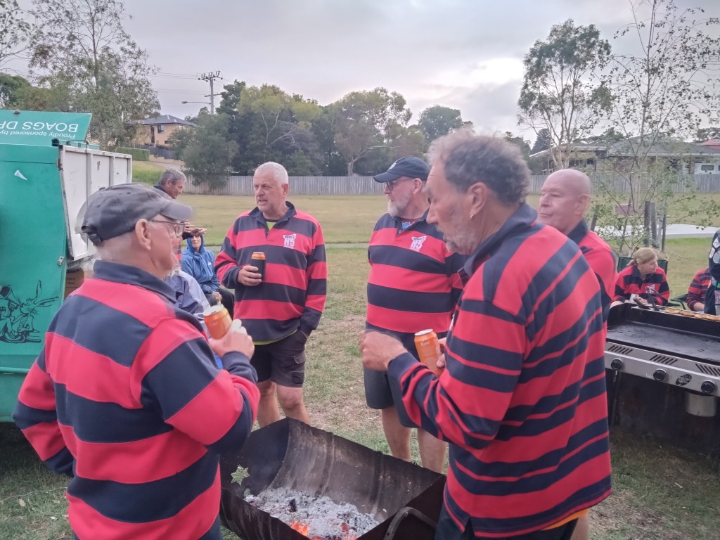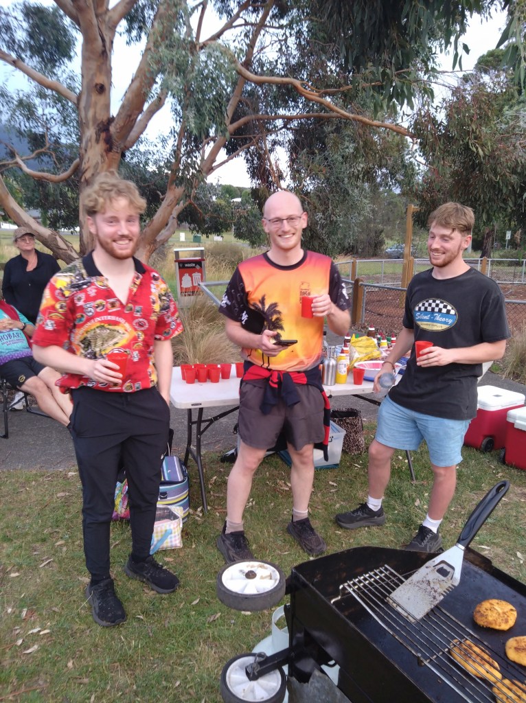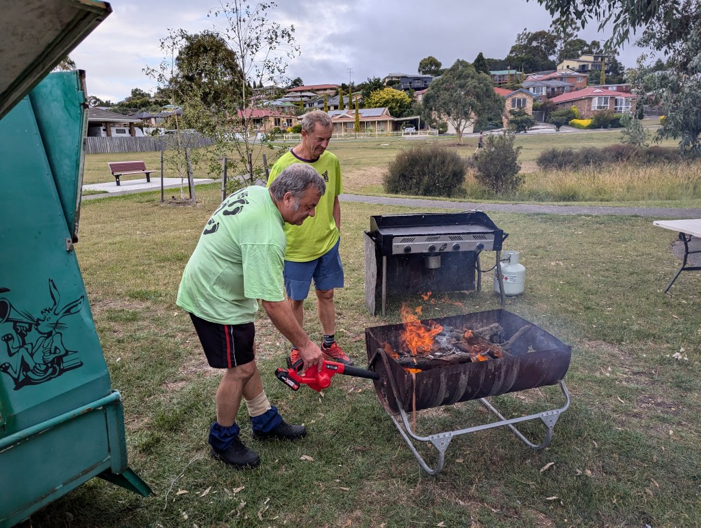 Hashers gathered at Hestercombe Reserve for H5 Run 2319 on an evening when rain threatened but did not fall, in line with Grizzly’s (often-untrue) claim that it never rains on a Hash trail. Next Week was there early, getting the Firemaster 5000 going so that the coals would be at perfect steak-cooking temperature when we returned from trail; after last week’s fire debacle, Next Week has decided he can’t rely on Hash infidels to do this important job. Sir Eve was there helping, using his blower despite 40 knot winds.