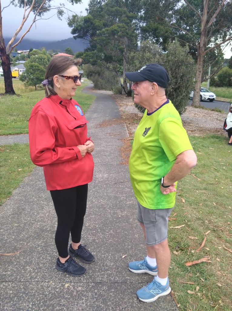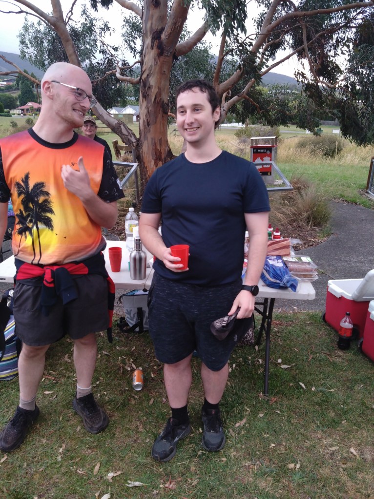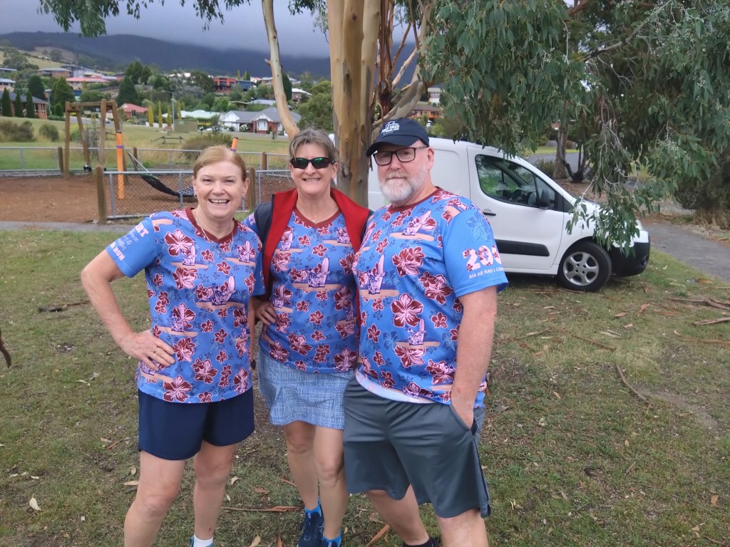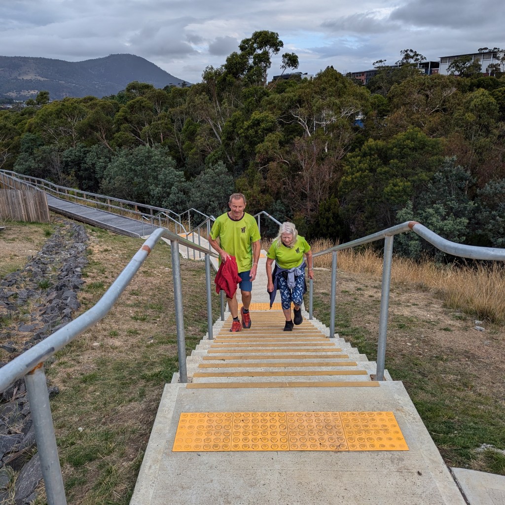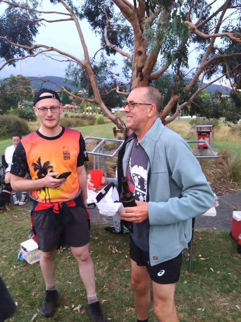 So, Sonar directed us away from the lagoon, toward the Derwent River. His chalk talk included reference to an NDIS trail, a short walk, a long walk, and a run. Way too confusing for Hashers, as shown by the fact that the runners, led by Pole Dancer, started off with a loop of the NDIS trail.