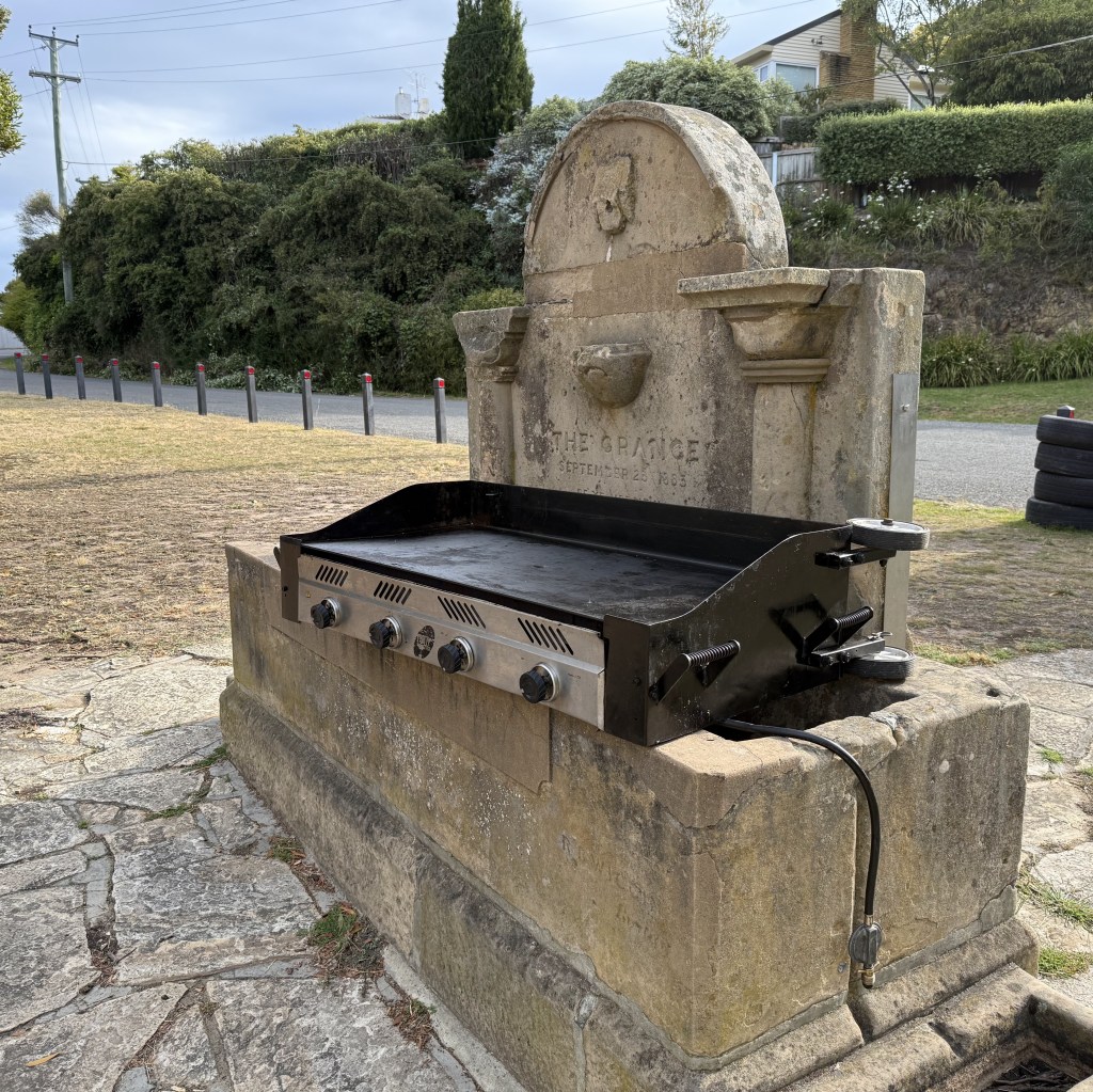 Highness Eager suggested that they just place it on the ground so that she wouldn’t have to keep jumping up to turn her sausage. Instead Snacky made use of a handy fire-proof structure on site – an 1835 sandstone memorial horse trough. You could hear the keyboards of the Sandy Bay and Taroona Citizens’ Collective Facebook group firing up.