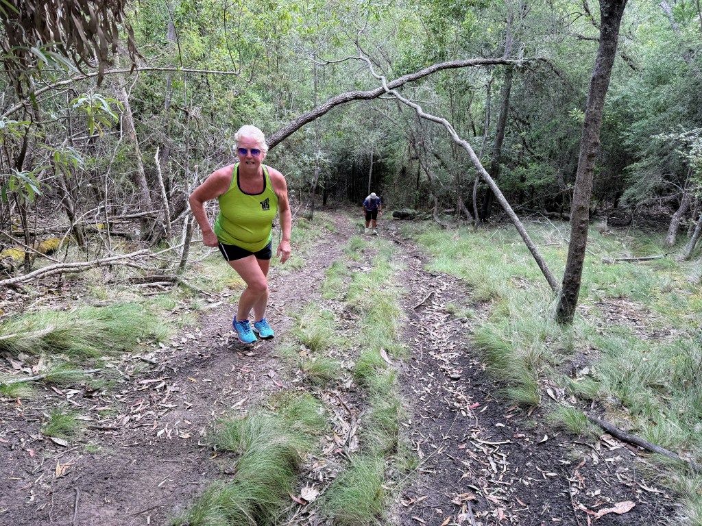 I was passed by Dobber, who paused long enough to explain that she was recovering from an Achilles problem and shouldn’t be running. But she did. Down a steep, rocky slope. Perhaps she goes to Can’t Stop’s doctor.