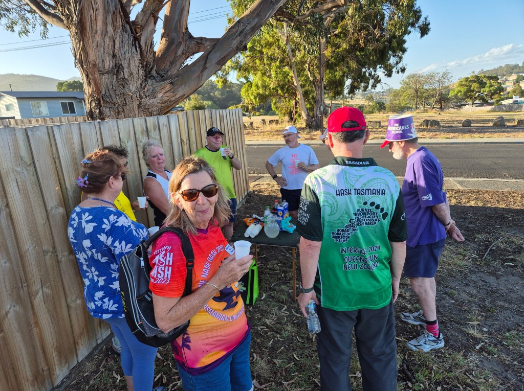 The walkers then meandered through some more country roads until hitting an intersection with signposts pointing to Toffolis Rd and Sky Farm Rd – real outposts of civilisation – before looping around for a return along Abbotsfield Rd. Just before the On On, Rigor Mortis was waiting as promised with the welcome Piss Stop (a dying tradition in H5) and an interesting selection of drinks. Well done, Rigor!