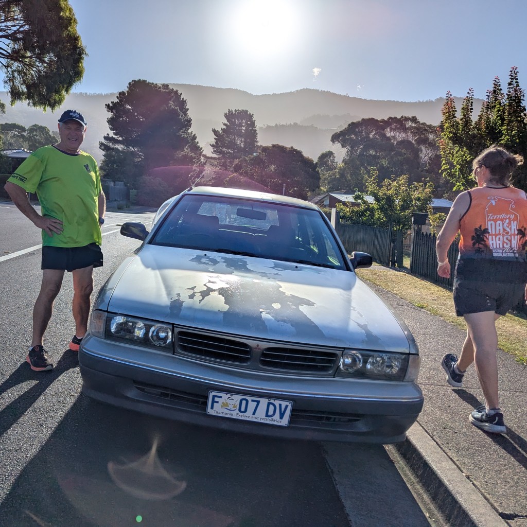Trail started along Colston St and through the back streets and paddocks of Claremont. An early check saw Can’t Stop shuffling up a hill that was far too steep for the heat, with other Hashers on power saving mode and yelling for him to check faster. Fortunately, the way forward proved to be flat (more or less).The sight of an ancient Magna rusting away in the street brought ITR to an extreme state of excitement as he cased it for spare parts.