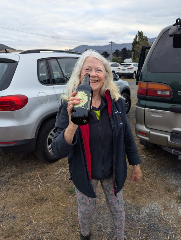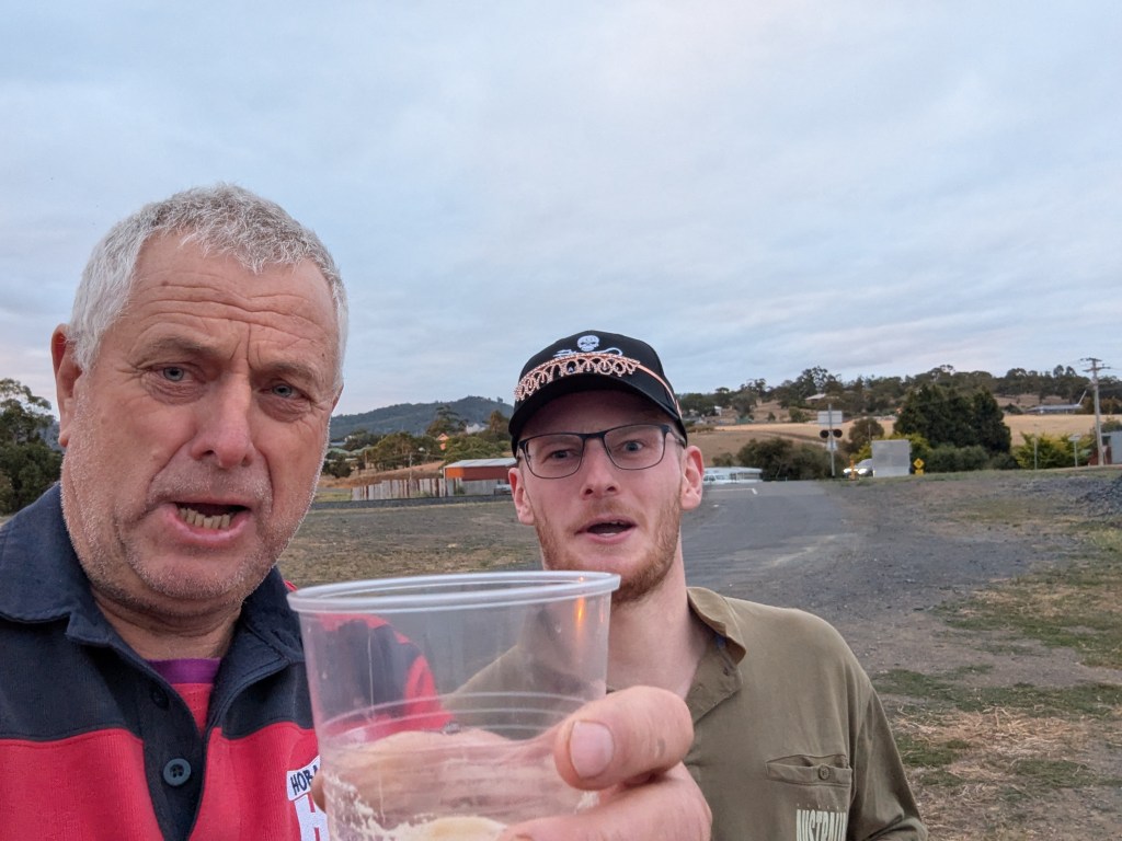 The pack set off along the railway line, with views of the River Derwent on our left. However, the most impressive view was of a goat out the back (of a van, to be precise). Don’t know how ITR engineered that, but it was incredibly impressive. (This is a paid advertisement, of course, funded from ITR’s ‘I Am Not The Most Hated Man In Hash’ marketing campaign.) An early and long FT caused some confusion, as it was supposed to be an FT for walkers and runners but not for the NDIS mob. ITR should have known from experience that this was way too complicated for Hashers.