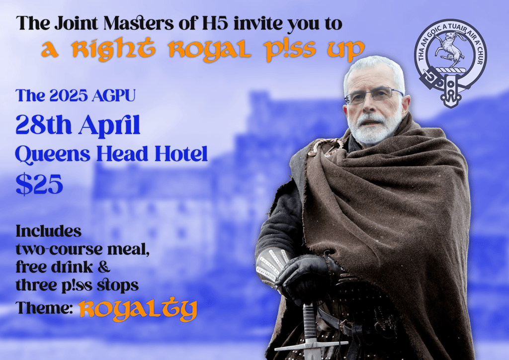 - Organ Grinder – give away Collingwood Hash shirt left at Snug because no-one was interested, not even their number one (and only) supporter at H5.
