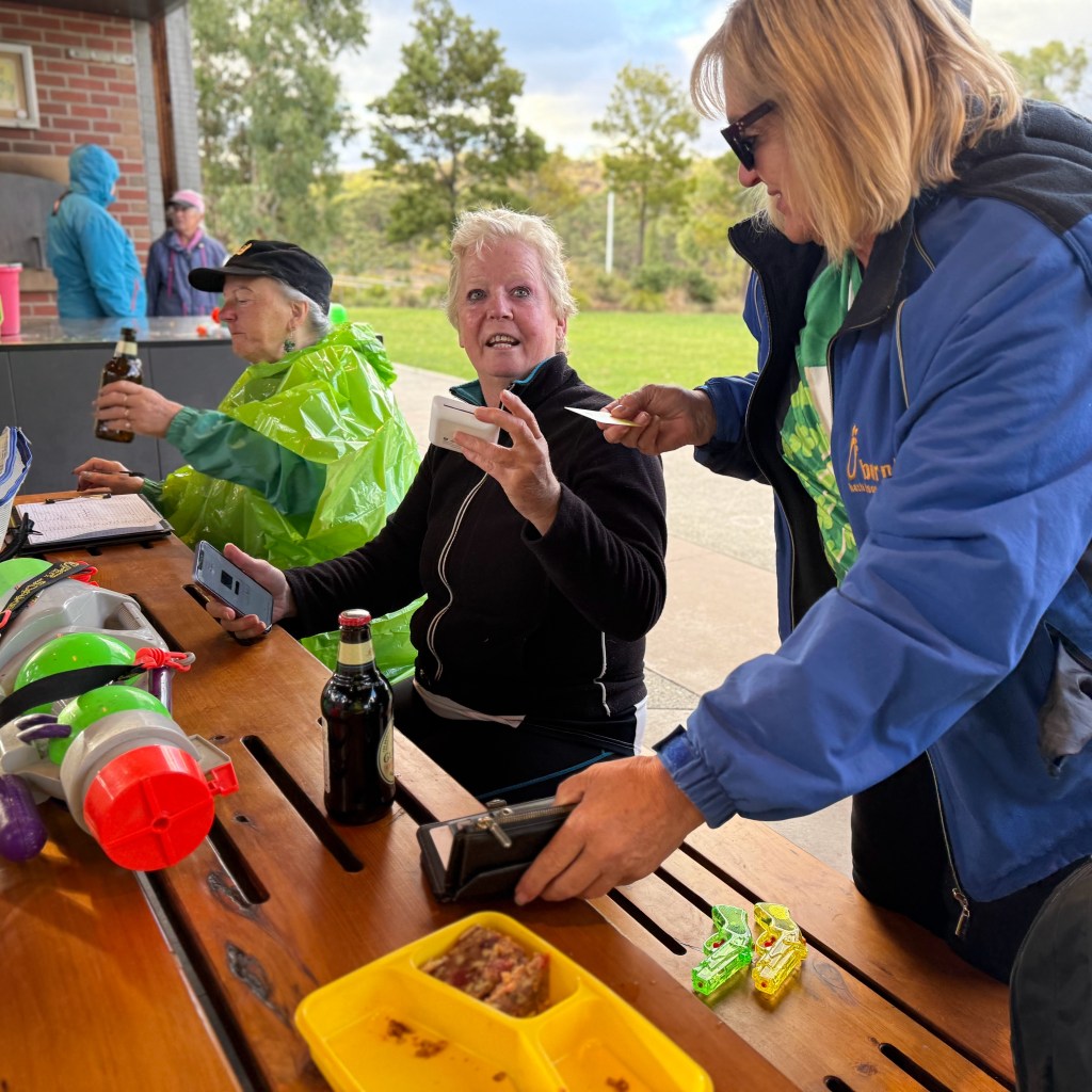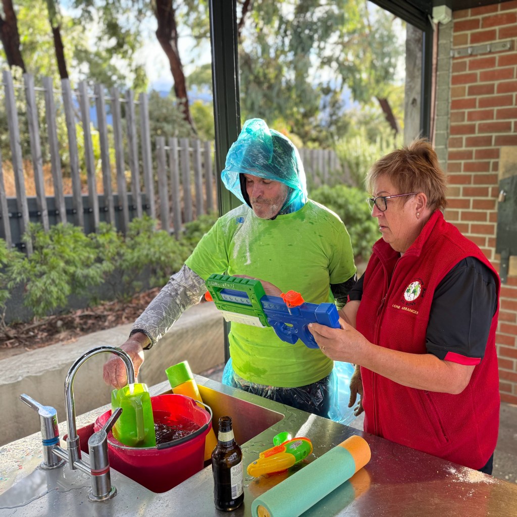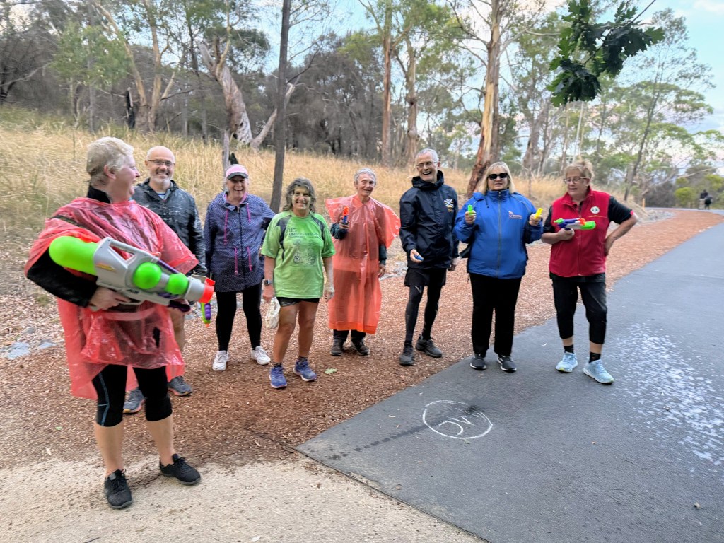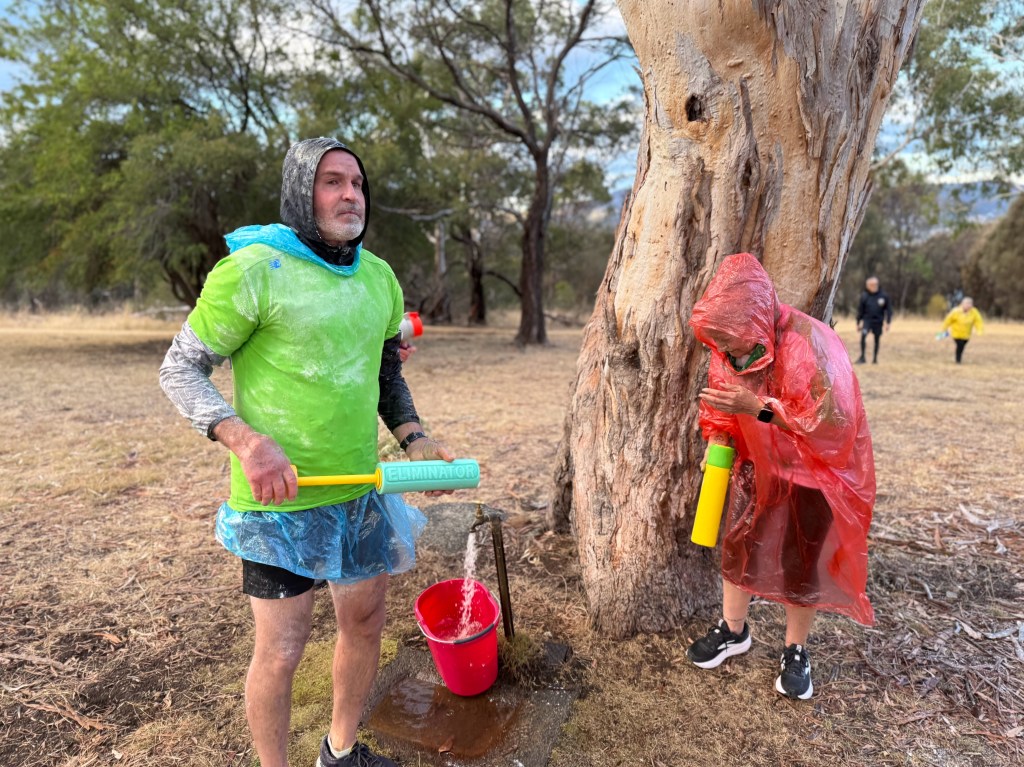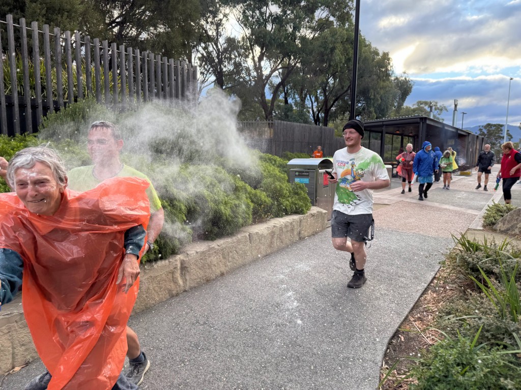 Initially, all was calm as the general Hash-day business took place, with only the odd range-finding watery blast hitting an unsuspecting target. The spacing between Hashers was reminiscent of post-COVID days, as various Hashers wrapped in plastic headed to the demilitarised zone around the Hash Cashiers, before retreating for cover.