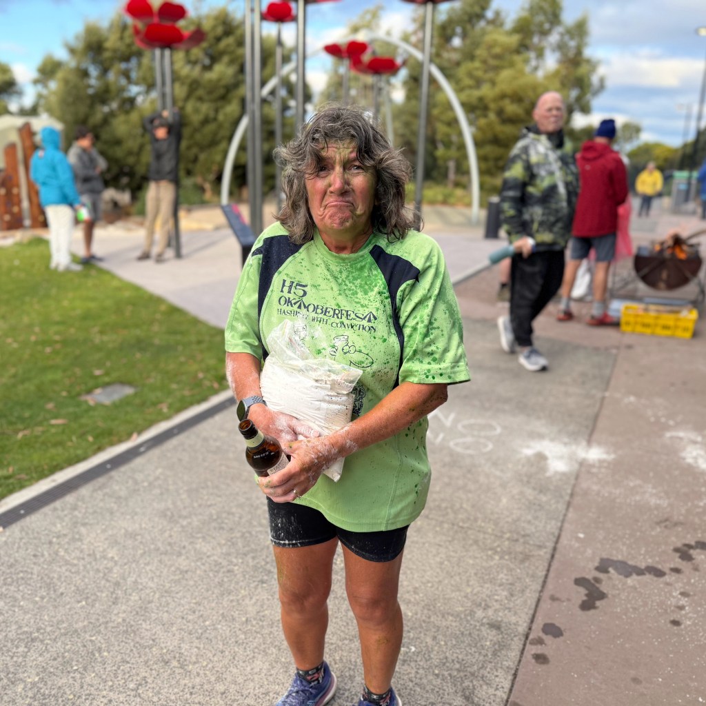 The reverse trail wasn’t at all confusing, but it did give some idea how to see the world as Fruit Loop might see it. When we doubled back around the clubrooms we were ambushed by the Hares, using their porn star money shot water cannons.