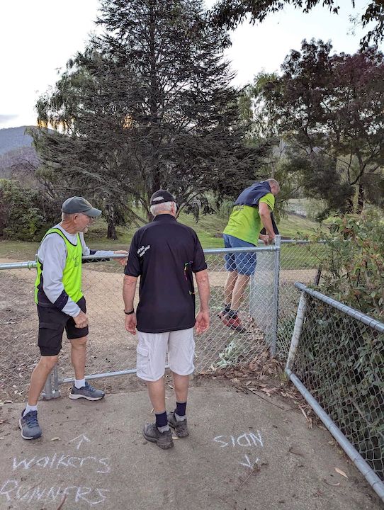 The bloody walkers talk so much that they can’t follow trail. Tonight’s no exception! Next Week, Bog Roll and Offal walking towards the west fence with no way out. After several calls to get their attention, they finally looked up, surprised that they were so far off trail. Back they come. Out of gate at 1919 hours. On On Home.